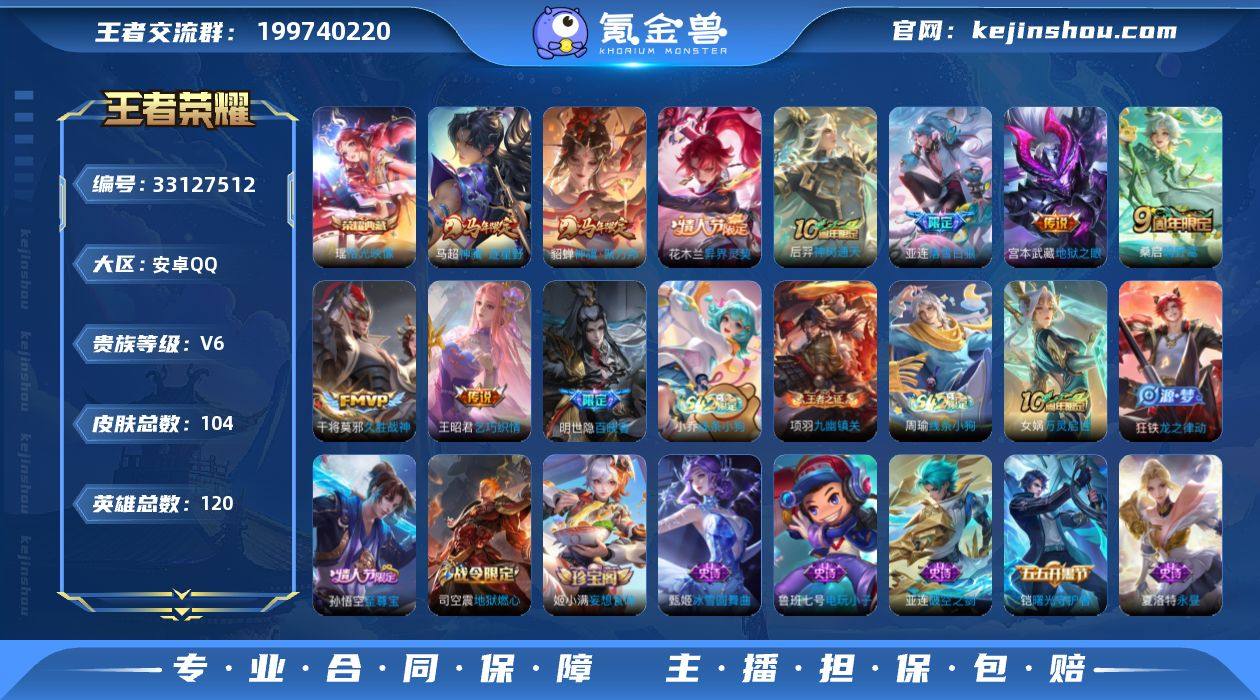 实名: 可修改 性别: 男号 贵族等级: V6 英雄数: 120 皮肤数: 104 荣耀水晶: 拾光映像 传说皮: 久胜战神,地狱之眼,乞巧织情,落雪白狼,神树通天,神骥·逐星野,神骥·聚万邦,异界灵契-花木兰 限定皮: 至尊宝,鸣野蒿,逐霄战戟 亮点: 【优质装备】:拾光映像(瑶典藏),久胜战神,地狱之眼,乞巧织情