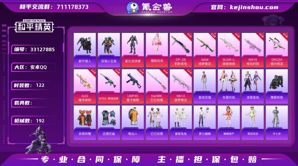 【LHPX1683】122套装/枪械12/装备216/战备114/王牌印记3/热力值53655/五级AKM-绿萝繁花/五级SCAR-L-锦绣绵绵/五级M416-电玩时刻/五级GROZA-镜光银凌/五级AUG-暖羊咩咩/五级M762-青锋波束/五级ACE32-萌骑漫游/五级UMP45-量子极限/五级Kar98K-巳巳如意/五级MK14-甜梦熊击/五级Mk14-福马献瑞/五级DP-28-豹影疾电/都市猎人/深海小丑鱼/龟仙人/复仇流浪者/樱桃泡泡/AKM绿萝繁花/SCAR-L-锦绣绵绵/M416电玩时刻/GROZA-镜光银凌/AUG-暖羊咩咩/M762-青锋波束/ACE32-萌骑漫游/UMP45量子极限/Kar98K-巳巳如意/MK14-甜梦熊击/Mk14-福马献瑞/DP-28-豹影疾电/祥瑞起舞飞行器/冠军兔兔飞行器/脆鲨七海飞行器/星之彼岸降落伞/圣堂之誓降落伞/创世·救赎降落伞/鬼刀降落伞/星穹咏叹调降落伞/炫彩糖果降落伞/巳巳如意/套装-马上有钱/雏菊兔兔/萝兰蝴蝶/糖糖葫芦/青团波波/许七安/燕燕于飞/鱼渊荷华/海琴烟/紫幽梦/蓝冰羽/星影赞美诗/极速光影/云朵鹅/雪绒豹/绛羽幽主/朱霞炽焰/凌霄紫焰/紫俏灵猫/AKM-夜灯/AKM-彩虹符号/AKM-影袭/AKM-破晓战魂/AKM-龙的传人/M16A4-红色方程式/M16A4-蓝色火焰/SCAR-L-夜灯/SCAR-L-炫彩节奏/M416-糯团青竹/M416-红色方程式/M416-蓝色火焰/GROZA-异彩先驱/GROZA-影袭...