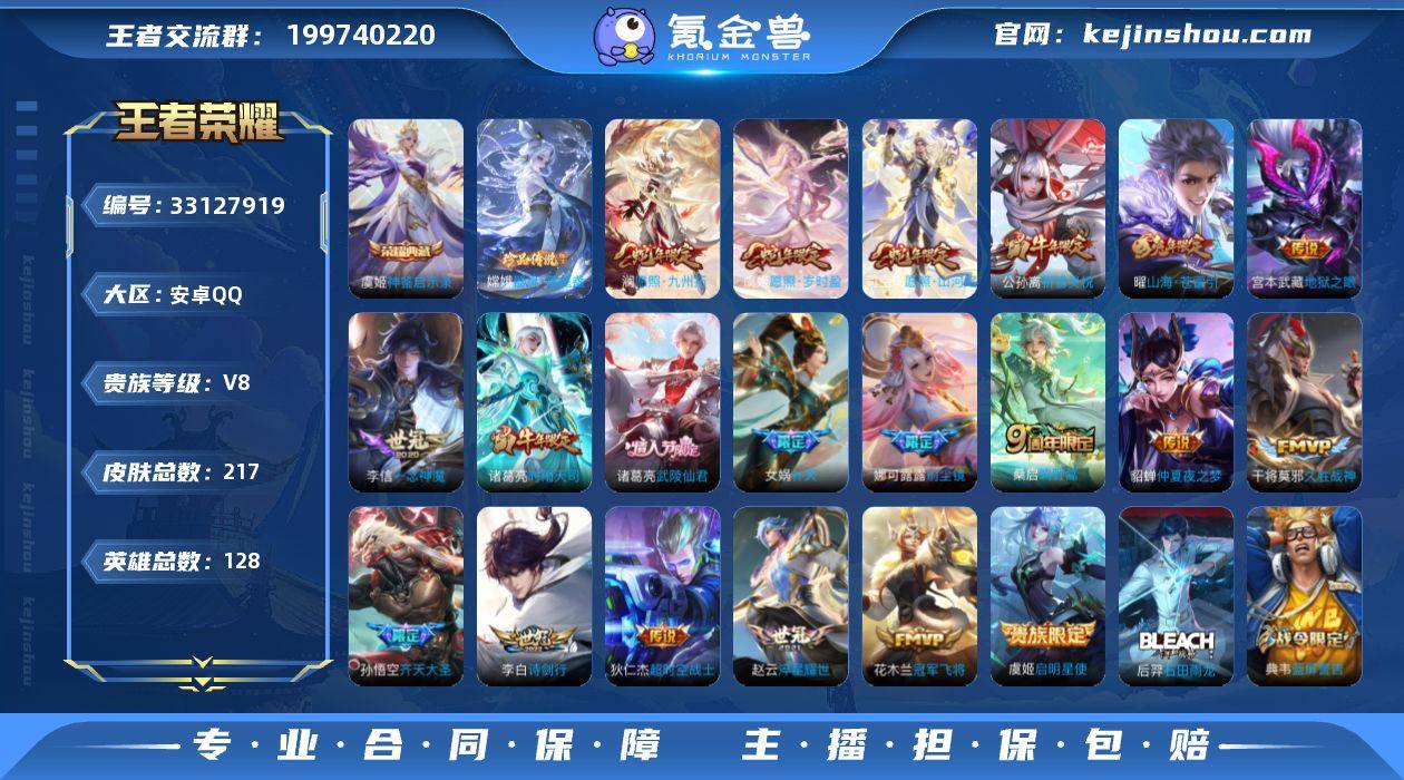 【虞姬典藏嫦娥珍品20个高质量传说多限定9个个性按键】安卓Q-V8-荣耀黄金II段位-128英雄-217皮肤-1典藏皮肤-1珍品传说-20传说-58史诗【英雄全皮】:娜可露露全皮,苍全皮【荣耀典藏】:虞姬神鉴启示录【珍品传说】:嫦娥器灵落星盏【传说皮肤】:司空震愿照山河定,澜愿照九州拓,虞姬愿照岁时盈,桑启鸣野蒿,孙悟空齐天大圣,曜山海苍雷引,李白诗剑行,娜可露露前尘镜,女娲补天,赵云淬星耀世,公孙离祈雪灵祝,诸葛亮时雨天司,虞姬启明星使,李信一念神魔,干将莫邪久胜战神,花木兰冠军飞将,诸葛亮武陵仙君,貂蝉仲夏夜之梦,宫本武藏地狱之眼,狄仁杰超时空战士【限定皮肤】:狄仁杰阴阳师,赵云皇家上将,赵云龙胆,鲁班七号狮舞东方,高渐离玩趣恶龙,钟无艳超时空战士,吕布御风骁将,元歌无心,夏侯惇朔风刀,甄姬落雪兰心,曹操烛龙,典韦蓝屏警告,马可波罗暗影游猎,马可波罗山海玄木吟,狄仁杰魔术师,狄仁杰万华元夜,达摩沙漠行僧,项羽海滩派对,老夫子醍醐杖,程咬金演武夺筹,韩信逐梦之影,韩信飞衡,韩信傲雪梅枪,兰陵王金庭之子,娜可露露前尘镜,孙悟空齐天大圣,牛魔御旌,李元芳银河之约,李元芳云中旅人,虞姬启明星使,钟馗神迹守卫,钟馗驱傩...