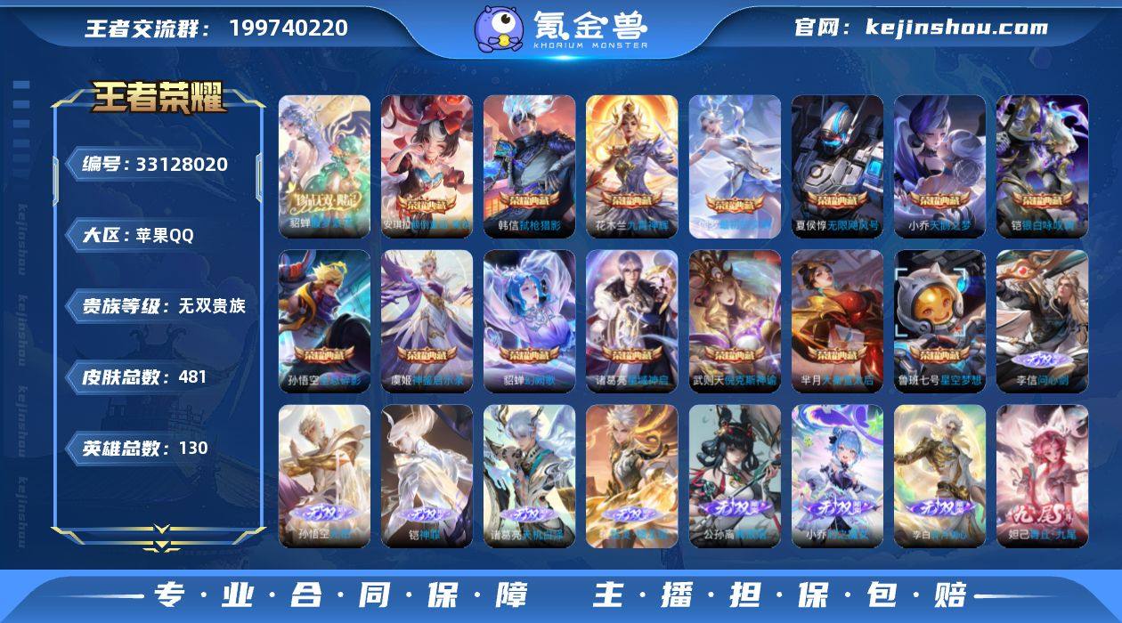 【王者荣耀】珍品无双1 典藏15 无双11 珍品传说8 传说57 史诗128 英雄130 皮肤481 贵族无双级 珍品无双:馥梦繁花__荣耀典藏:无限飓风号|全息碎影|天鹅之梦|大秦宣太后|武则天|神鉴启示录|银白咏叹调|幻阙歌|九霄神辉|倪克斯神谕|弑枪猎影|星空梦想|星域神启|最初的交响|颠倒童话·魔镜__无双皮肤:时之魔女|碎月剑心|真我赫兹|离恨烟|雪境奇遇|器灵·螭龙剑|青丘·九尾|天机白泽|神罪|无相|问心剑__珍品传说:江户川柯南|怪盗基德|孙策-时之奇旅|器灵·落星盏|大耳狗之梦|酷洛米之心|朽木白哉|沧流箭__传说皮肤:鸣野蒿|挚爱花嫁|挚爱之约|补天|炽阳神光|启明星使|地狱火|海洋之心|仲夏夜之梦|黄金射手座|黄金白羊座|游龙清影|瑶-时之祈愿|炽翼辉光|鹤羽星尊|大乔-时之奇旅|金乌负日|铠-琥珀纪元|吕布-曦玄引|祈雪灵祝|时雨天司|武陵仙君|项羽-无限倾心|小动物乐团|小乔-音你心动|星穹之声|影龙天霄|永恒水手月亮|永曜之星|虞姬-无限倾心|乘龙·淬吴钩|觅芳踪|山海·苍雷引|山海·琳琅生|朵莉亚-心动手记|灼幽烈阳|冥王哈迪斯|牧神诗旅|幻光神枪|愿照·岁时盈|愿照·山河定|愿照·九州拓|愿照·众生和|愿照·福禄聚|星之鸣奏|愿照·千秋盛|千劫归真|续相思|死亡执政官|诡秘之主|千山共赴|神树...