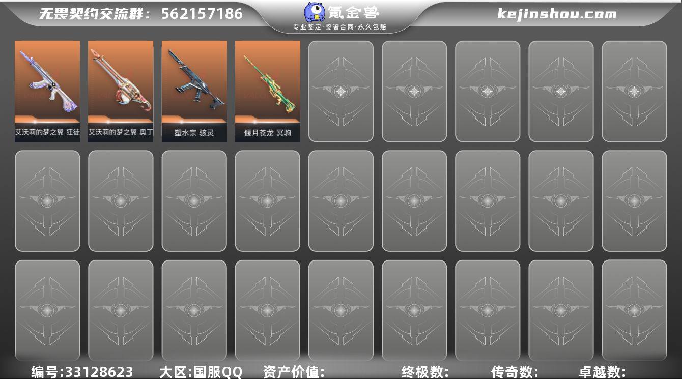 [18393655]2橙皮 2金皮 1紫皮 7皮肤 15英雄 30卡面 255已用源晶 未定级段位 【佩枪皮肤】鬼魅-天界神兵 【冲锋枪皮肤】骇灵-塑水宗 【步枪皮肤】狂徒-艾沃莉的梦之翼 【狙击枪皮肤】冥驹-偃月苍龙 【机枪皮肤】奥丁-艾沃莉的梦之翼 【挂饰】V26第一幕纪念币 挂饰,H2-Oh!挂饰,无畏契约GO!第一卷芮娜挂饰,无畏契约GO!第一卷捷风挂饰,神中神挂饰