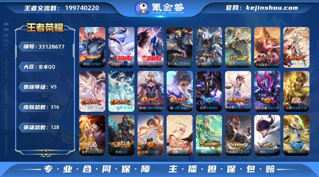 【店长推荐·弑枪猎影·江户川柯南·怪盗基德·星际治安官·零号雷霆··千山共赴·愿照众生和·愿照九州拓·愿照岁时盈·黄金天蝎座·金乌负日·貂蝉曦玄引·乘龙问璇玑·山海苍雷引·山海炽霜斩·挚爱之约·武圣·天魔缭乱·山海玄木吟·引擎之心·至尊宝·逐梦之星·玄武志·寅虎御盾·蜜橘之夏·冰锋战神·虞姬霸王别姬·鸿兔大展天幕·多限定·多款热门传说皮·224幸运值·可二次】YXw23524-安卓Q-128英雄-316皮肤-19王者印记-220铭文-贵族积分7w【贵族8】【1典藏·2珍品·2星传说·26传说·2天幕·12按键·224幸运值】【因赛季更新游戏段付以上号为准!】 【英雄全皮】:敖隐全皮 【荣耀典藏】:韩信弑枪猎影 【珍品传说】:鲁班七号江户川柯南,马可波罗怪盗基德 【星元皮肤】:狄仁杰星际治安官,孙悟空零号雷霆 【天幕】:共赏芳华天幕,鸿兔大展天幕 【传说皮肤】:后羿神树通天,干将莫邪千山共赴,妲己愿照众生和,澜愿照九州拓,虞姬愿照岁时盈,云缨幻光神枪,桑启鸣野蒿,墨子黄金天蝎座,海月金乌负日,貂蝉曦玄引,孙尚香乘龙问璇玑,曜山海苍雷引,李信山海炽霜斩,李白诗剑行,百里守约碎云,孙策挚爱之约,王昭君乞巧织情,李元芳飞鸢探春,虞姬启明星使,孙悟空零号赤焰,关羽武圣,干将莫邪久胜...