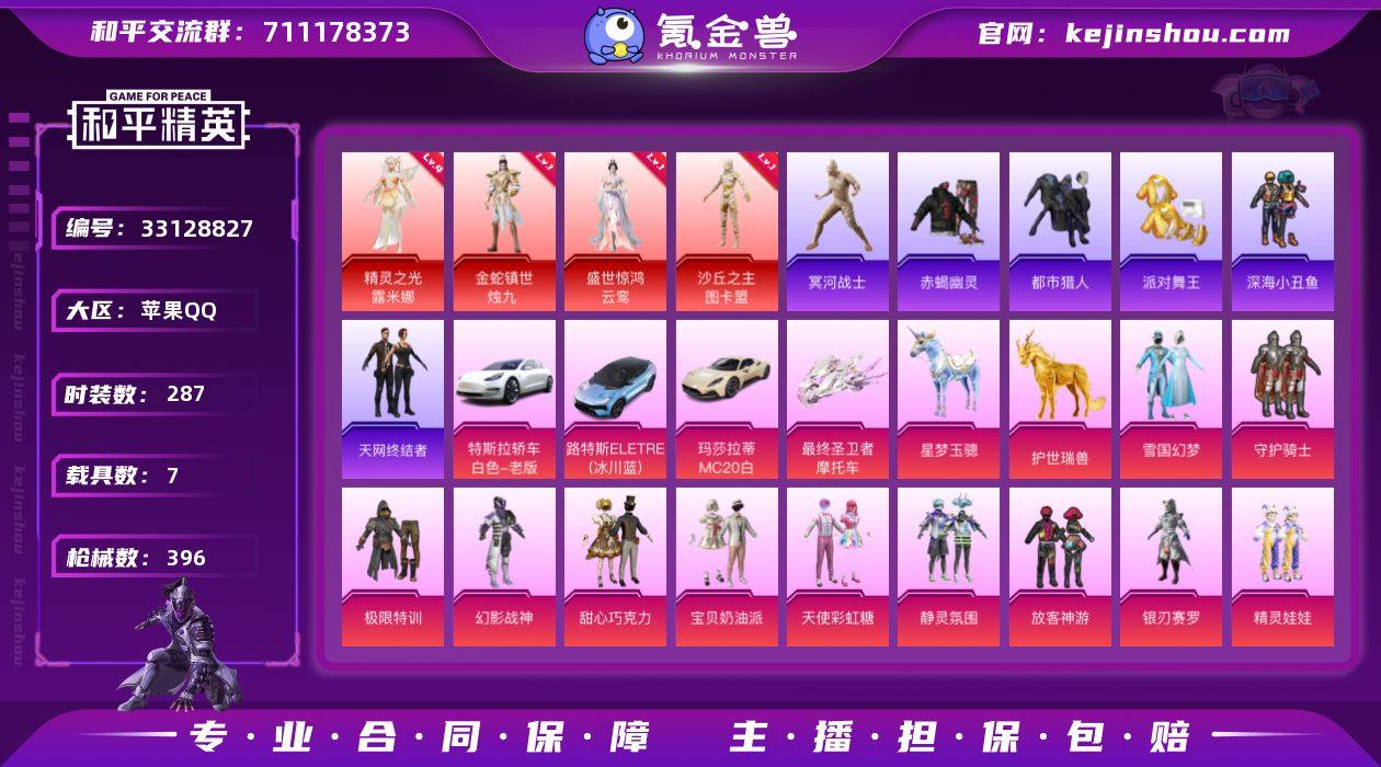 【LHPX1914】287套装/枪械21/装备500/载具7/战备284/王牌印记17/热力值152366/三级AKM-幽焰骑士/三级AKM-暮色玫影/六级SCAR-L-机甲封神/三级SCAR-L-灵驹仙姬/六级M416-五爪金龙/三级M416-女娲灵识/三级GROZA-精灵之光/五级GROZA-镜光银凌/三级AUG-星梦奇缘/五级AUG-暖羊咩咩/五级M762-甜心娃娃/三级UMP45-萌骑冒险/三级Vector-最终圣卫者/二级MK12-雪月幻音/五级AKS-74U-森灵之息/三级P90-沙丘之主/五级Kar98K-巳巳如意/三级MK14-盛世惊鸿/五级Mk14-福马献瑞/五级DP-28-扶摇飞仙/五级DP-28-豹影疾电/一级金蛇镇世-烛九/一级盛世惊鸿-云鸾/四级精灵之光-露米娜/一级沙丘之主-图卡盟/金蛇镇世-烛九/盛世惊鸿-云鸾/精灵之光-露米娜/沙丘之主-图卡盟/雪国幻梦/浪漫天命/赤蝎幽灵/都市猎人/冥河战士/派对舞王/深海小丑鱼/小丑鱼/天网终结者/忍者信条/粉红小猪/熔岩游骑兵连帽夹克/红熊茄茄/守护骑士/极限特训/幻影战神/甜心巧克力/宝贝奶油派/天使彩虹糖/静灵氛围/放客神游/银刃赛罗/精灵娃娃/恐龙拽拽/千面幻镜/樱桃泡泡/幻彩电音/人物-小舞·灵珑/人物-小舞·雪昙/人物-小舞·恋语/角色-千仞雪/特斯拉Model 3(珍珠白)/路特斯ELETRE(冰川蓝)/玛莎拉蒂MC20(星石白)/最终圣卫者摩托车/...
