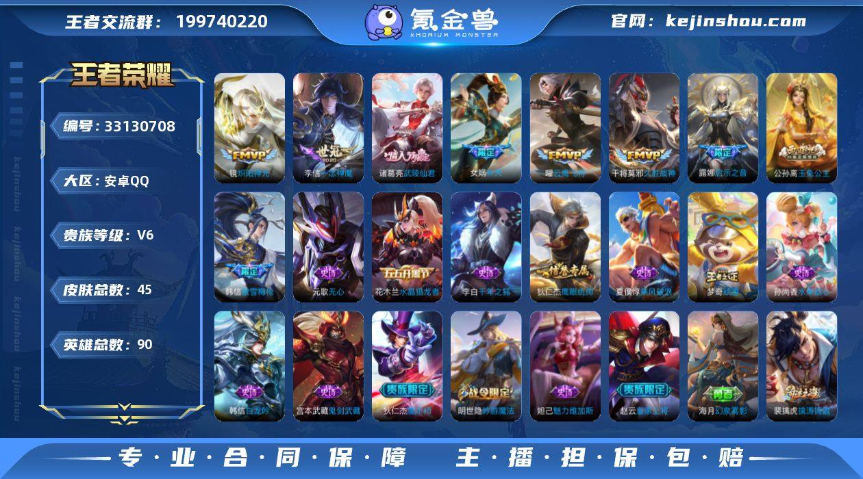实名: 可修改 性别: 男号 贵族等级: V6 英雄数: 90 皮肤数: 45 传说皮: 云鹰飞将,久胜战神,炽阳神光,一念神魔 限定皮: 武陵仙君,傲雪梅枪,补天,玉兔公主,启示之音 亮点: 【优质装备】:云鹰飞将(小将军),久胜战神,炽阳神光,一念神魔