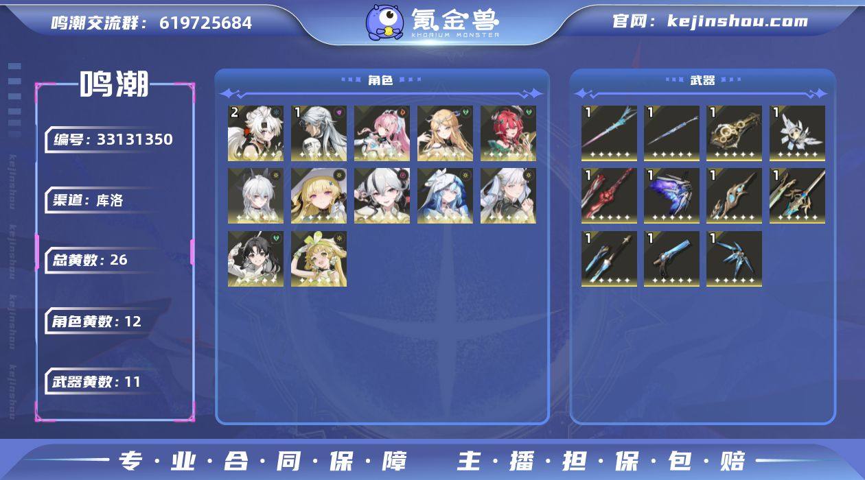 男/女主: 男主 总黄数: 26 联觉等级: 80 拥有五星共鸣者: 鉴心,卡卡罗,维里奈,凌阳,今汐,守岸人,椿,菲比,赞妮,夏空,卡提希娅,爱弥斯 2鸣五星共鸣者: 2鸣凌阳 1鸣五星共鸣者: 1鸣卡卡罗 0鸣五星共鸣者: 0鸣鉴心,0鸣维里奈,0鸣今汐,0鸣守岸人,0鸣椿,0鸣菲比,0鸣赞妮,0鸣夏空,0鸣卡提希娅,0鸣爱弥斯 拥有五星武器: 千古洑流,停驻之烟,漪澜浮录,时和岁稔,星序协响,裁春,和光回唱,血誓盟约,焰光裁定,不屈命定之冠,永远的启明星 1鸣五星武器: 1鸣千古洑流,1鸣停驻之烟,1鸣漪澜浮录,1鸣时和岁稔,1鸣星序协响,1鸣裁春,1鸣和光回唱,1鸣血誓盟约,1鸣焰光裁定,1鸣不屈命定之冠,1鸣永远的启明星 亮点: 【MC173】80级/26黄/男主/12个五星角色/11个五星武器未绑定,爱弥斯,卡提希娅,赞妮,夏空,菲比,椿,守岸人,今汐,维里奈,鉴心,卡卡罗,凌阳,永远的启明星,不屈命定之冠,焰光裁定,血誓盟约,和光回唱,裁春,星序协响,时和岁稔,千古洑流,停驻之烟,漪澜浮录,2命凌阳,1命卡卡罗,0命爱弥斯,0命卡提希娅,0命赞妮,0命夏空,0命菲比,0命椿,0命守岸人,0命今汐,0命维里奈,0命鉴心,精1永远的启明星,精1不屈命定之冠,精1焰光裁定,精1血誓盟约,精1和光回唱,精1裁春,精1星序协响,精1时和岁稔,精1千古洑流,精1停...