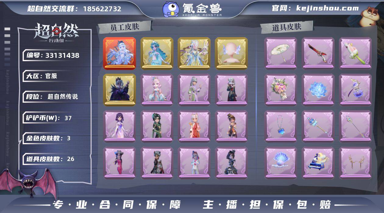 金色皮肤数量: 3 紫色皮肤数量: 12 道具皮肤数量: 26 段位: 超自然传说 员工: 逍遥,薇薇安,巫铃儿,莉莉,阿念,艾伦,小黄,零,爱丽丝,爱德华,兰,小满,临云 外观: 嘻嘻头套,烈焰红唇头套,呆滞头套,卑微头套,哈士奇头套,滑稽头套,鱼头怪头套,面具马头套,萨卡班甲鱼头套,钗头凤,迷途僵宝,梵音莲华,异色序曲,精致露比头套,绒绒对决,渡鸦公爵,雪墩墩头套,太空鲨头套,黎明猎手,耀眼的你,庆宴绮愿,炽天使的余烬,晚安小熊,烛光纪念,瑶台梦,醉花阴,不朽的今夜,牛啤背包,沧海之遗,海月息潮,琢玉怀乡,磨砺成锋,织锦云程,听潮祝福,饺饺者头套,夜浮船,孤独对望,园丁鲨鲨头套,梵卓之礼,煤球喵,万迭云华,燕燕于飞