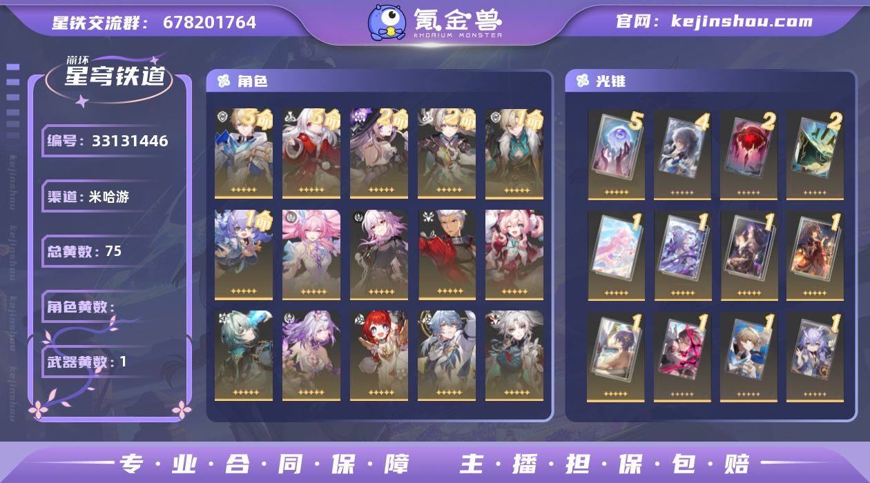 总黄数: 75 五星光锥数: 1 开拓等级: 70 开拓者性别: 女 3命金色角色: 3命克拉拉,3命杰帕德 2命金色角色: 2命流萤,2命大黑塔 1命金色角色: 1命白露,1命砂金 精5武器: 精5记忆永不落幕 精4武器: 精4但战斗还未结束 精2武器: 精2记一位星神的陨落,精2星海巡航 精1武器: 精1时节不居,精1如泥酣眠,精1制胜的瞬间,精1以世界之名,精1纯粹思维的洗礼,精1游戏尘寰,精1向着不可追问处,精1让告别,更美一些,精1爱如此刻永恒 亮点: 【xt93】等级:70/总黄数:75/女主/角色黄数:40昔涟,长夜月,Archer,风堇,那刻夏,遐蝶,缇宝,大黑塔,星期日,飞霄,流萤,知更鸟,砂金,黄泉,花火,真理医生,阮•梅,托帕&账账,符玄,刃,白露,克拉拉,杰帕德,布洛妮娅,瓦尔特,姬子,爱如此刻永恒,让告别,更美一些,记忆永不落幕,向着不可追问处,游戏尘寰,纯粹思维的洗礼,时节不居,但战斗还未结束,制胜的瞬间,如泥酣眠,以世界之名,星海巡航,记一位星神的陨落,3命克拉拉,3命杰帕德,2命大黑塔,2命流萤,1命砂金,1命白露,0命昔涟,0命长夜月,0命Archer,0命风堇,0命那刻夏,0命遐蝶,0命缇宝,0命星期日,0命飞霄,0命知更鸟,0命黄泉,0命花火,0命真理医生,0命阮•梅,0命托帕&账账,0命符玄,0命刃,0命布洛妮娅,0命瓦尔特,0命姬子,精5...
