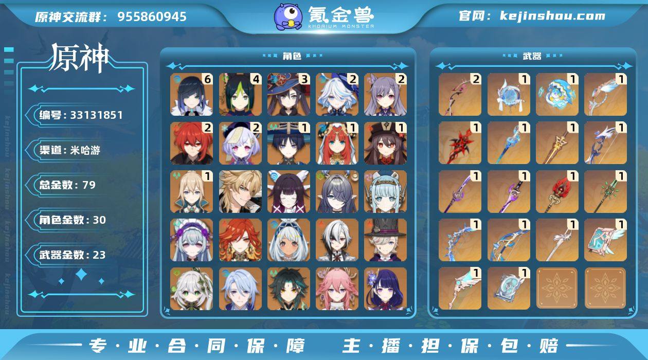 邮箱: 不送邮/死邮 总黄数: 79 冒险等级: 60 6命金色角色: 满命夜兰 4命金色角色: 四命提纳里 3命金色角色: 三命莫娜 2命金色角色: 二命迪卢克,二命七七,二命刻晴,二命芙宁娜 1命金色角色: 一命琴,一命胡桃,一命妮露,一命流浪者 0命金色角色: 枫原万叶,达达利亚,钟离,甘雨,魈,雷电将军,八重神子,神里绫人,纳西妲,迪希雅,林尼,阿蕾奇诺,玛拉妮,玛薇卡,梦见月瑞希,伊涅芙,菈乌玛,哥伦比娅,法尔伽 拥有武器: 天空之翼,雾切之回光,四风原典,天空之卷,和璞鸢,风鹰剑,护摩之杖,薙草之稻光,终末嗟叹之诗,冬极白星,若水,圣显之钥,最初的大魔术,静水流涌之辉,赤月之形,白雨心弦,冲浪时光,帷间夜曲 2精武器: 最初的大魔术 1精武器: 天空之翼,雾切之回光,四风原典,天空之卷,和璞鸢,风鹰剑,护摩之杖,薙草之稻光,终末嗟叹之诗,冬极白星,若水,圣显之钥,静水流涌之辉,赤月之形,白雨心弦,冲浪时光,帷间夜曲 亮点: 【sy135】79黄30人满命夜兰2命水神 少女仆人带专武火神伊涅芙菈乌玛等1971260级/79黄/女主/30个五星角色/23个五星武器0命阿蕾奇诺,2命芙宁娜,0命林尼,0命迪希雅,1命流浪者,0命纳西妲,1命妮露,4命提纳里,满命夜兰,0命神里绫人,0命八重神子,0命雷电将军,0命枫原万叶,0命钟离,1命胡桃...