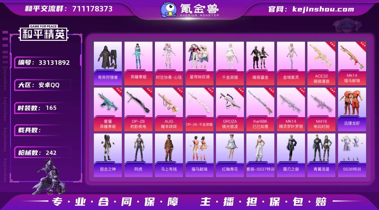 【蜘蛛侠星河浪客螳螂6粉装10特效枪 秒换绑不用等】 安卓Q区-72300热力值-165套装-242枪皮 【3稀有】 奇异狩猎者 星河浪客 Mark.06蓝螳螂【6粉装】 暗夜鎏金 角色-异瞳寒姬 角色-金域紫灵 星穹咏叹调 时空协奏·心弦 角色-千金淑猫【10特效枪】 Mk14-福马献瑞(5级) ACE32-萌骑漫游(5级) Mk14-精灵梦叶罗丽(7级) DP-28-千金淑猫(6级) 蜜獾-异瞳寒姬(7级) Kar98K-巳巳如意(5级) AUG-暖羊咩咩(5级) M416-电玩时刻(5级) GROZA-镜光银凌(5级) DP-28-豹影疾电(5级)【257热门】 雪山精英(老6服) 迅捷狂鲨 大橘为重 白色伏地魔 SS27特训 SS24特训 SS23特训 SS22特训 M762-橘柚倾心 AKM-缤纷海域 SCAR-L-玉兔迎春 Mk47-乌木金纹 UZI-娇憨猪猪 UMP45-炫光之旅 S12K-垂柳戏鸭 DBS-彩虹符号 MG3-幻世战舞者 AKM-霓虹街区 鹰眼刺客 M416-蓝色火焰 GROZA-彩虹符号 破蛋小黄鸡 长空猛禽 虚音幻奏 甜心亚梦 特训学院 青涩时光 青年教官 魅力单车 蓝色运动 橘黑制服 竞技达人朋克 黄色运动 漫步者 黄色伏地魔 红色运动 黑色伏地魔 海岛探路者 纯真浪花 粉红小猪 S1897-糯团青竹 MK20-H-樱桃泡泡 AA12-G-雨过天青 沙漠之鹰-雨过天青 Mini14-绯穹魔姬 平底锅-画境星梦 海琴烟 P90-紫矿核心 GROZA-...