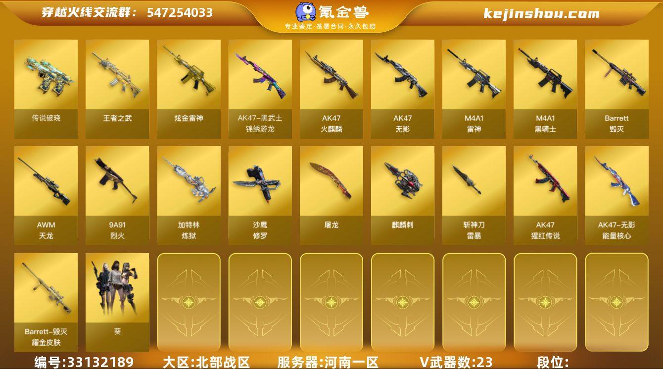北部战区(河南一区)ys【队伤小号】传说【传说破晓】23v【AK47-火麒麟,M4A1-雷神,M4A1-黑骑士,AK47-无影,9A91-烈火,AWM-天龙,Barrett-毁灭,加特林-炼狱,沙鹰-修罗,屠龙,麒麟刺】1王者【王者之武】2炫金【炫金雷神,炫金骑士】1角色【葵】7皮【加特林-炼狱-星空,修罗-能量核心,无影-能量核心,毁灭-耀金,雷神-暗月】 截图展示段位不代表实际段位 如赛季更新等不可抗拒因素发生变化、时限道具不保证所剩时间