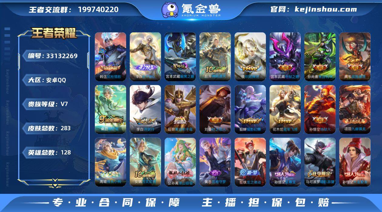 【特价出售/店主推荐/2市标/32段打野】:安卓Q-V7-最强王者段位-128英雄-283皮肤-1典藏皮肤-1无双-1星元-12传说-69史诗 【英雄全皮】:孙权全皮,敖隐全皮 【荣耀典藏】:韩信弑枪猎影 【无双皮肤】:李白碎月剑心 【传说皮肤】:后羿神树通天,桑启鸣野蒿,典韦战鼓燎原,李白诗剑行,镜炽阳神光,刘备时之恋人,貂蝉猫影幻舞,花木兰冠军飞将,后羿黄金射手座,孙尚香末日机甲,宫本武藏地狱之眼,孙悟空地狱火 【限定皮肤】:白起狰,姜子牙天穹之誓,狄仁杰阴阳师,赵云皇家上将,孙尚香蔷薇恋人,鲁班七号狮舞东方,高渐离死亡摇滚,钟无艳超时空战士,芈月重明,周瑜赤莲之焰,元歌无心,夏侯惇朔风刀,甄姬落雪兰心,曹操烛龙,典韦穷奇,马可波罗暗影游猎,狄仁杰魔术师,狄仁杰万华元夜,达摩沙漠行僧,项羽海滩派对,老夫子醍醐杖,程咬金演武夺筹,兰陵王驯魔猎人,兰陵王金庭之子,孙悟空至尊宝,孙悟空大圣娶亲,牛魔御旌,后羿辉光之辰,李元芳银河之约,李元芳云中旅人,钟馗神迹守卫,雅典娜黎明之约,蔡文姬繁星吟游,太乙真人饕餮,鬼谷子原初探秘者,鬼谷子五谷丰年,百里玄策原初追逐者,弈星混沌棋,梦奇顽趣,沈梦溪星空之诺,沈梦溪大漠名商,明世隐疑...