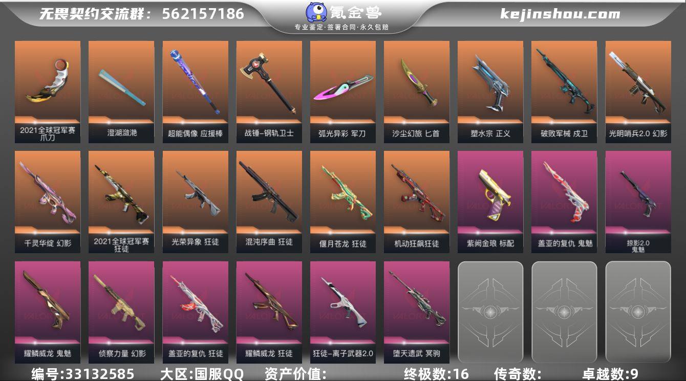 【套装】:2021全球冠军赛套装,耀鳞威龙套装【英雄】:幻棱,炼狱,维斯,暮蝶,钛狐,壹决,铁臂,捷风,雷兹,幽影,不死鸟,贤者,猎枭,蝰蛇,零,芮娜,奇乐,尚勃勒,霓虹,斯凯,夜露,星礈,K/O,海神,盖可,黑梦,钢锁【近战武器】:近战武器-2021全球冠军赛 爪刀,近战武器-威龙之刃,近战武器-澄湖潋滟,近战武器-超能偶像 应援棒,近战武器-钢轨卫士 战锤,近战武器-弧光异彩 军刀,近战武器-沙尘幻旅 匕首【狂徒】:狂徒-2021全球冠军赛,狂徒-混沌序曲,狂徒-机动狂飙,狂徒-偃月苍龙,狂徒-光荣异象,狂徒-盖亚的复仇,狂徒-耀鳞威龙,狂徒-离子武器//2.0,狂徒-超能偶像,狂徒-钢轨卫士,狂徒-弧光异彩,狂徒-沙尘幻旅【幻影】:幻影-光明哨兵//2.0,幻影-千灵华绽,幻影-侦察力量,幻影-噬源兽防卫工程,幻影-珍珠棘贝,幻影-聚合之力,幻影-战术小伙伴【戍卫】:戍卫-破败军械,戍卫-超能偶像,戍卫-钢轨卫士,戍卫-珍珠棘贝,戍卫-彩梦之城,戍卫-萌彩剪影【獠犬】:獠犬-弧光异彩,獠犬-采蜜小蜂队,獠犬-复古浪潮,獠犬-胡桃狂想,獠犬-战术小伙伴【冥驹】:冥驹-堕天遗武,冥驹-复古浪潮,冥驹-胡桃狂想【飞将】:飞将-沙尘幻旅,飞将-聚合之力,飞将...