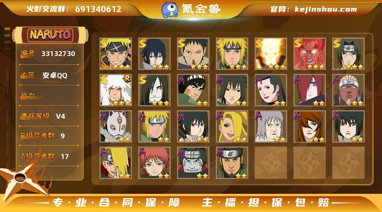 V4/S忍9/A忍17/三星S-宇智波佐助「永恒万花筒」/二星A-长门「青年」/2星小南「神驹佑将」/三星S-宇智波带土 「忍界大战」/二星A-蝎/三星S-漩涡鸣人·宇智波佐助/二星A-照美冥「五代目水影」/三星S-波风水门/三星S-漩涡鸣人 「九喇嘛连结」/二星A-神秘面具男 「忍者之路」/二星A-波风水门 「青年」/三星S-自来也「舞之豪杰」/三星S-迈特凯「死门」/二星A-迪达拉「秽土转生」/二星A-猿飞阿斯玛/二星A-宇智波佐助「万花筒写轮眼」/二星A-宇智波泉奈/二星A-迪达拉/二星A-干柿鬼鲛/三星S-大蛇丸/二星A-艾 「青年」/二星A-不缘/二星A-迈特凯「青春爆炸」/二星A-宇智波佐助「须佐能乎」/二星A-千代「近松十人卫」/三星S-宇智波鼬 「须佐能乎」