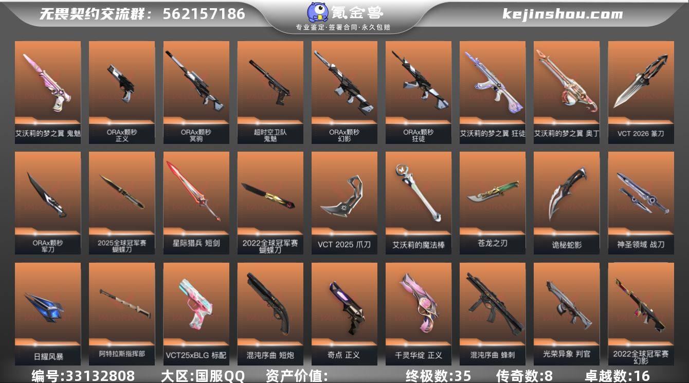 【套装】:2025全球冠军赛套装,2022全球冠军赛套装,VCT 2026 赛季套装,ORA x 颗秒套装,VCT 2025 赛季套装【英雄】:幻棱,炼狱,维斯,暮蝶,钛狐,壹决,铁臂,捷风,雷兹,幽影,不死鸟,贤者,猎枭,蝰蛇,零,芮娜,奇乐,尚勃勒,霓虹,斯凯,夜露,星礈,K/O,海神,盖可,黑梦,钢锁【近战武器】:近战武器-2025全球冠军赛 蝴蝶刀,近战武器-2022全球冠军赛 蝴蝶刀,近战武器-碎心裂刃,近战武器-VCT 2026 篆刀,近战武器-ORA x 颗秒 军刀,近战武器-5周年//公测重制版 苍龙之刃,近战武器-VCT 2025 爪刀,近战武器-镭切,近战武器-艾沃莉的魔法棒,近战武器-天御刀,近战武器-诡秘蛇影 军刀,近战武器-神圣领域 战刀,近战武器-日耀风暴 遗器,近战武器-阿特拉斯指挥部 甩棍,近战武器-星际猎兵 短剑【狂徒】:狂徒-2025全球冠军赛,狂徒-归零者,狂徒-混沌序曲,狂徒-全息波普//2.0,狂徒-RGX 11z Pro,狂徒-光荣异象,狂徒-ORA x 颗秒,狂徒-荆刺圣骸,狂徒-艾沃莉的梦之翼,狂徒-掠影,狂徒-盖世英雄,狂徒-离子武器//2.0,狂徒-诡秘蛇影【幻影】:幻影-2022全球冠军赛,幻影-黯夜怪谈,幻影-电音光谱,幻影-ORA x 颗秒,幻影-般若假面,幻影-离子武器,幻影-...