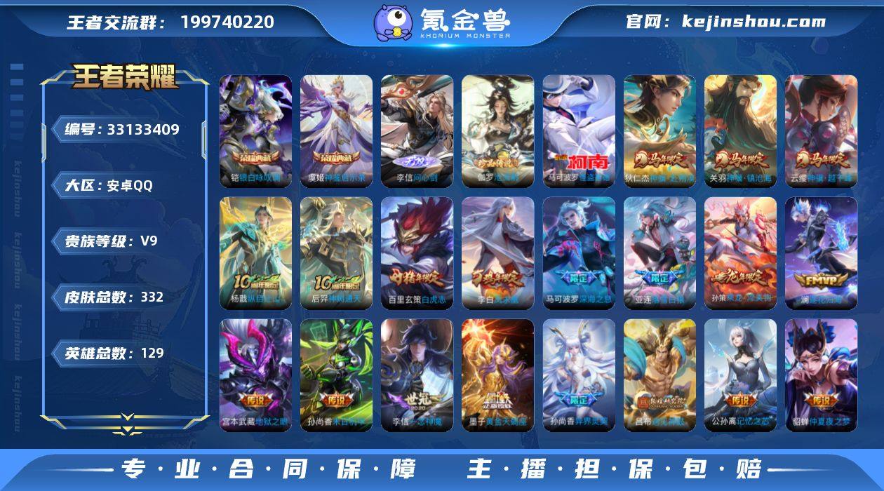【Hwz1080】【特价出售】:安卓Q-V9-可二次-5市标-14县标-129英雄-332皮肤-2典藏皮肤-1无双-2珍品传说-33传说-96史诗(问心剑、银白咏叹调、神鉴启示录、怪盗基德、沧流箭) 【英雄全皮】:孙权全皮,敖隐全皮,蒙恬全皮,戈娅全皮,海诺全皮 【荣耀典藏】:铠银白咏叹调,虞姬神鉴启示录 【无双皮肤】:李信问心剑 【珍品传说】:伽罗沧流箭,马可波罗怪盗基德 【传说皮肤】:云缨神骥越千峰,关羽神骥镇沧海,狄仁杰神骥赴朔漠,杨戬纵目迁山,后羿神树通天,墨子黄金天蝎座,亚连落雪白狼,孙策乘龙淬吴钩,铠琥珀纪元,澜逐花归海,吕布遇见神鼓,马可波罗妄想实况,公孙离记忆之芯,项羽无限倾心,孙悟空齐天大圣,马可波罗深海之息,鲁班七号寅虎瑞焰,孙尚香异界灵契,李元芳飞鸢探春,铠绛天战甲,虞姬启明星使,李信一念神魔,刘备时之恋人,张良黄金白羊座,干将莫邪久胜战神,百里玄策白虎志,后羿黄金射手座,貂蝉仲夏夜之梦,李白凤求凰,孙尚香末日机甲,宫本武藏地狱之眼,孙悟空地狱火,狄仁杰超时空战士 【限定皮肤】:白起狰,暃埋骨钱,大乔绒语心约,姜子牙天穹之誓,狄仁杰阴阳师,赵云皇家上将,孙尚香异界灵契,鲁班七号寅虎瑞焰,高渐离玩趣恶龙,钟...