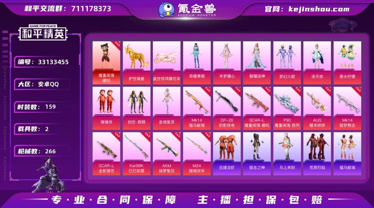 【3级哪吒10特效枪9粉装2载具 秒换绑不用等】 安卓Q区-87217热力值-159套装-266枪皮 【1红装】 魔童闹海-哪吒(3级)【2载具】 护世瑞兽 盛世惊鸿摩托车【1稀有】 Mark.06蓝螳螂【9粉装】 梦幻火箭 洛天依 香水柠檬 玩偶服-猪猪侠 创世·救赎 角色-异瞳寒姬 角色-金域紫灵 角色-智耀战神 角色-羊梦糖心【10特效枪】 SCAR-L-金蛇镇世(3级) M24-镜域双华(3级) Mk14-福马献瑞(5级) AKM-绿萝繁花(5级) Kar98K-巳巳如意(5级) Mk14-甜梦熊击(5级) AUG-暖羊咩咩(5级) DP-28-豹影疾电(5级) P90-魔童闹海 敖丙(3级) SCAR-L-魔童闹海 哪吒(3级)【278热门】 团圆交子 白色伏地魔 SS27特训 SS26特训 SS25特训 SS24特训 SS23特训 SS22特训 Mk47-洛神天依 Mini14-梦幻火箭 SCAR-L-玉兔迎春 GROZA-田园牧歌 GROZA-恐龙拽拽 M762-彩虹符号 Mk47-乌木金纹 Mini14-旋转彩虹 UZI-娇憨猪猪 UMP45-蓝色火焰 M249-彩虹符号 AKM-春暖花开 GROZA-春暖花开 破蛋小黄鸡 长空猛禽 青涩时光 骑行爱好者 霓虹街区 妙红点点 懵萌河马 魅力单车 拉斐尔 黄色伏地魔 黑色伏地魔 海岛探路者 淡雅花蕊 纯真浪花 春日漫步 MK12-金蛇镇世 S1897-糯团青竹 平底锅-画境星梦 超感刻度 P90-紫矿核心 GROZA-紫矿核心 玲珑侠...