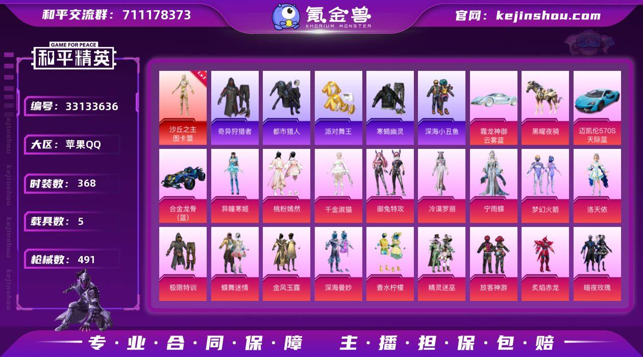 【4级图卡盟巡查衣都市猎人寒蝎金鞋小熊背包LED眼罩19粉装19特效枪5载具身法素材号 秒换绑不用等】 苹果Q区-170661热力值-368套装-491枪皮 【1红装】 沙丘之主-图卡盟(4级)【5载具】 玛莎拉蒂Ghibli(粉) 合金龙骨(蓝) 迈凯伦570S(天际蓝) 霜龙神御(云雾蓝) 黑曜夜骑【12稀有】 都市猎人 派对舞王(金靴子) 萌熊伴侣背包(小熊背包) 巡查衣 寒蝎幽灵 攀登者外套/裤子 M416-黄金龙骨 放客神游眼镜LED眼罩 奇异狩猎者 AWM-黄金龙骨 红眼罩 Mark.06蓝螳螂【20粉装】 放客神游 极限特训 梦幻火箭 洛天依 圣堂之誓 香水柠檬 暗夜玫瑰 蝶舞迷情 精灵迷巫 炙焰赤龙 金风玉露 深海曼妙 角色-冷漠罗丽 角色-宁雨蝶 桃粉嫣然 御兔特攻 角色-异瞳寒姬 角色-千金淑猫 金丰海韵【19特效枪】 M416-至情至圣(9级) M416-灵猫魔法师(3级) AKM-幽焰骑士(6级) M416-五爪金龙(2级) M416-风花雪月(1级) AKM-梦之光华(6级) Mk14-福马献瑞(5级) SCAR-L-青春物语(5级) SCAR-L-锦绣绵绵(5级) M24-星之信仰(7级) MG3-洛神天依(5级) 破片手榴弹-秋玉花灯(7级) Mk14-精灵梦叶罗丽(5级) M762-青锋波束(5级) DP-28-千金淑猫(1级) Kar98K-巳巳如意(5级) GROZA-镜光银凌(5级) DP-28-豹影疾电(5级) UMP45-量...