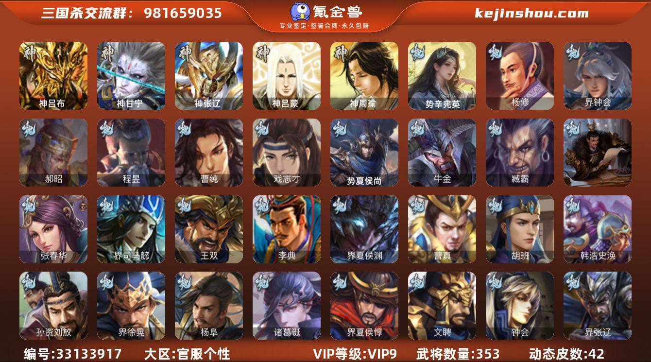 【14790046】官阶:大将军;VIP等级:VIP9;史诗武将数量:33;动态皮肤数量:42;武将总数:353;史诗宝珠数量:0;将魂数量:7908;神将:3;魏国史诗武将:14;蜀国史诗武将:7;吴国史诗武将:5;群史诗武将:11