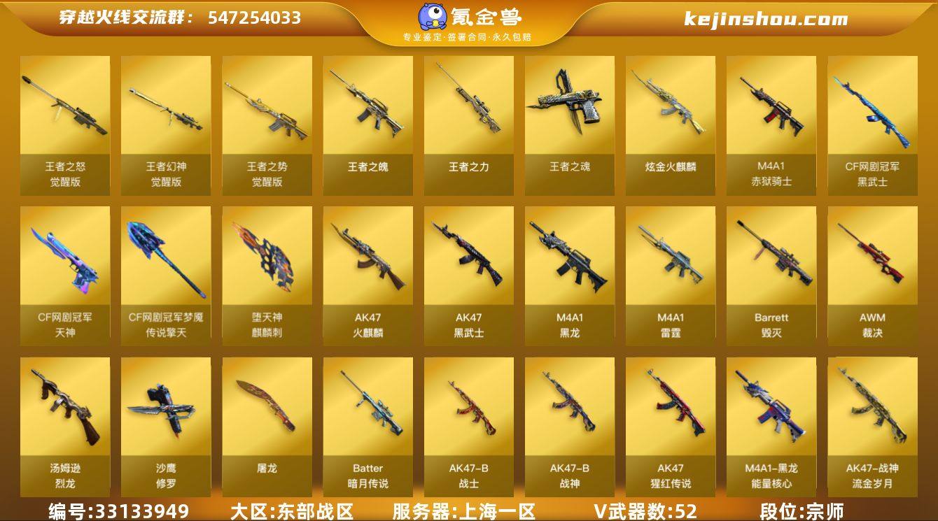 【ky6778】上海一区-58V-6王者武器数-1炫金武器数 【热门武器】:死亡之眼,金色小号,汤姆逊-烈龙*4,沙鹰-修罗 【王者炫金武器】:王者之魄,王者之力,王者之魂,炫金火麒麟 【音效卡】:AK47-火麒麟音效卡,M4A1-黑骑士音效卡,Barrett-毁灭音效卡 【皮肤】:裁决-运输船 皮肤,雷神-神秘按键 皮肤,火麒麟-冠军之心,毁灭-虹光风暴 皮肤,毁灭-英雄计划 皮肤,黑龙-能量核心,战神-粉色甜心皮肤,战神-紫绶金章皮肤*12,战神-流金岁月皮肤*5,天龙-能量核心,AWM-天龙-传奇白鲨,屠龙-惊鸿 皮肤 【角色】:炫,王者玲珑,蛇隐宗,奇洋探员,乔伊教练,修道士,云海玲珑,暗夜-X,芳心审判者,风暴女,兰-海滩派对,兰妹妹,潘多拉-X,潘多拉-甜心教官,潜龙队-X,青霞仙子,蛇姬,兔囡囡,雪莉杨-摸金校尉,影武者-X,潘多拉-N 【人偶武器】:M4A1-雷神-精英刀锋,AWM-灵狐-15周年嘉年华,M37-葵,夺魂,生化手雷-机甲核心,闪光弹-小乔,迷你超能女侍 【暴走生化】:死亡之眼 【英雄级武器】:AK47-火麒麟,M4A1-黑龙,AK47-黑武士,M4A1-雷霆,王者之势-觉醒版,AK-47-猩红传说*9,AK47-B-战神,黑武士-CF网剧冠军,AK47-B-战士,Barrett-毁灭,AWM-裁决,王者之怒-觉...