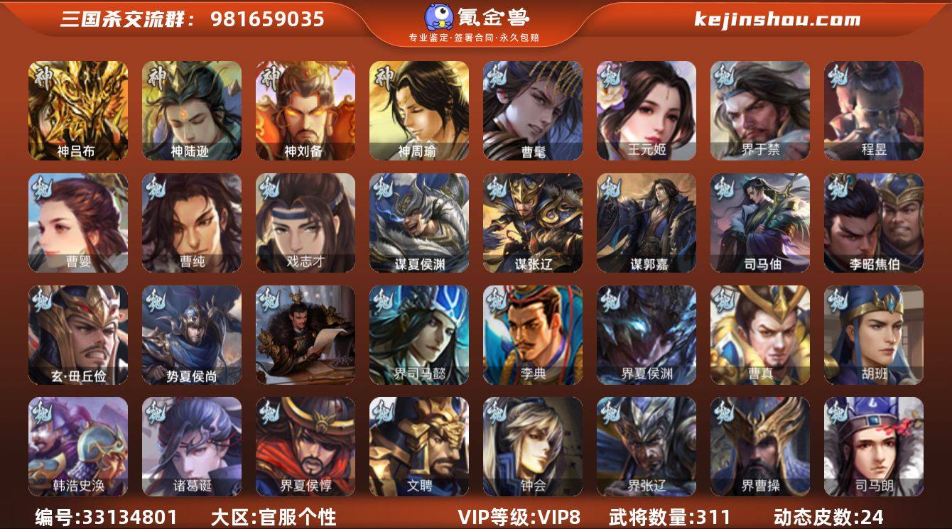 【14790041】官阶:骠骑将军;VIP等级:VIP8;史诗武将数量:31;动态皮肤数量:24;武将总数:311;史诗宝珠数量:42;将魂数量:2038;神将:3;魏国史诗武将:12;蜀国史诗武将:5;吴国史诗武将:4;群史诗武将:12