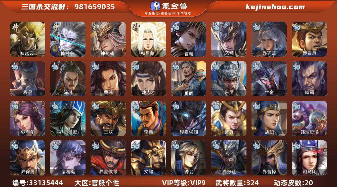 VIP等级: VIP9 官阶: 骠骑将军 武将数量: 324 动态皮肤数量: 20 神将: 神甘宁,神荀彧,神赵云,神吕蒙 魏国武将: 戏志才,曹纯,陈琳,程昱,界曹真,界钟会,文鸯,张辽,SP蔡文姬,SP关羽,SP贾诩,SP姜维,SP庞德,卞夫人,曹昂,曹操,曹冲,曹洪,曹丕,曹仁,曹叡,曹嵩,王异,鲁芝,界满宠,曹休,界曹植,满宠,荀攸,王基,钟繇,蒯越蒯良,郭嘉,荀彧,阮慧,杜畿,界郭嘉,崔琰,界荀彧,朱灵,吕虔,界王异,界许褚,陈群,界典韦,袁涣,李通,乐进,辛宪英,郭淮,郭皇后,夏侯惇,曹植,司马朗,谋于禁,界曹操,许褚,界张辽,谋徐晃,钟会,文聘,曹彰,界夏侯惇,诸葛诞,司马懿,甄姬,界徐晃,徐晃,韩浩史涣,胡班,曹真,典韦,界夏侯渊,夏侯渊,李典,于禁,王双,邓艾,界司马懿,张春华,臧霸,牛金,朱灵(国战),曹髦,董昭 蜀国武将: 董允,花鬘,谯周,诸葛瞻,谋马超,谋赵云,蜀-谋孙尚香,徐庶,界魏延,界关羽,界诸葛亮,邓芝,界伊籍,费祎,严颜,赵云,张松,彭羕,李丰,界刘备,刘封,糜竺,谋庞统,黄月英,刘巴,关羽,吴懿,界廖化,祝融,张飞,黄皓,魏延,界周仓,马忠,界法正,界孟获,刘禅,界赵云,界祝融,SP孙尚香,SP徐庶,卧龙诸葛,周仓,简雍,谋孟获,界关兴张苞,诸葛亮,孙乾,界卧龙诸葛,法正,赵统赵广,陈到,界马岱,关平,马岱,界庞统,庞统,诸葛果,谋张飞,...