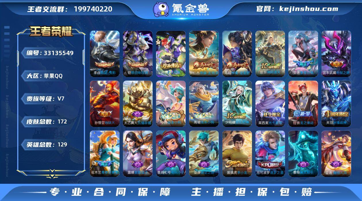 【精品账号·172皮肤-2典藏皮肤-1珍品传说·李白凯典藏·落雪白狼+亚连全皮·冰锋战神·青春决赛季·逐梦之星·狄仁杰马超年限+7按键满级铭文】 苹果Q-V7-最强王者段位-129英雄-172皮肤-2典藏皮肤-1珍品传说-6传说-44史诗 【英雄全皮】:孙权全皮,亚连全皮,敖隐全皮 【荣耀典藏】:李白鸣剑曳影,铠银白咏叹调 【珍品传说】:孙策时之奇旅 【传说皮肤】:狄仁杰神骥赴朔漠,马超神骥逐星野,后羿神树通天,亚连落雪白狼,宫本武藏地狱之眼,孙悟空地狱火 【限定皮肤】:虞姬夏日便利店,狄仁杰阴阳师,赵云皇家上将,墨子神迹守卫,嬴政优雅恋人,嬴政白昼王子,阿轲迷踪丽影,吕布猎兽之王,曹操烛龙,典韦穷奇,马可波罗逐梦之星,狄仁杰魔术师,达摩沙漠行僧,项羽海滩派对,老夫子航海奇遇记,关羽冰锋战神,刘邦夺宝奇兵,兰陵王金庭之子,花木兰青春决赛季,后羿圣弓游侠,李元芳云中旅人,钟馗驱傩正仪,杨玉环遇见飞天,女娲朔望之晖,雅典娜黎明之约,太乙真人饕餮,沈梦溪大漠名商,明世隐疑决卦,裴擒虎李小龙,狂铁御狮,米莱狄御霄,桑启海盐诗旅,艾琳女武神,亚连落雪白狼,鲁班七号蔬乡物语,李元芳蔬乡物语,刘邦剑破天穹,程咬金群星魔术团,镜青焰无极,项羽苍...