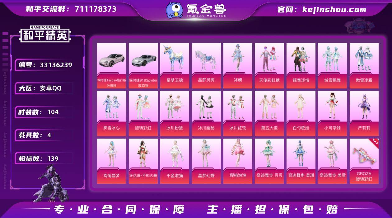 全女漂亮号安卓 手Q-23粉装-12特效枪-4载具-4粉色飞行器-55092热力值-4王牌印记-104套装-139枪皮 【热门品类】:套装-粉红小猪 【粉色套装】:粉装-天使彩虹糖,粉装-蝶舞迷情,粉装-绒雪飘舞,粉装-傲雪凌霜,粉装-霁雪冰心,粉装-旋转彩虹,粉装-冰川粉黛,粉装-冰川幽秘,粉装-冰川红玫,粉装-第五大道,角色-白勺歌姬,角色-小可学妹,角色-严莉莉,角色-鸢尾晶梦,角色-狂花道·不知火舞,角色-千金淑猫,角色-晶梦幻蝶,角色-樱桃泡泡,角色-奇迹舞步 贝贝,角色-奇迹舞步 美琪,角色-奇迹舞步 美雪,角色-冰魄,角色-虹云熊熊 【粉色枪皮等级】:AKM-甜心宝贝(六级),M16A4-晶梦幻蝶(四级),GROZA-旋转彩虹(七级),GROZA-精灵之光(三级),UMP45-萌骑冒险(二级),AKS-74U-森灵之息(五级),Kar98K-巳巳如意(四级),Mk14-福马献瑞(二级),M249-霁蓝缠春(三级),DP-28-千金淑猫(二级),DP-28-豹影疾电(五级),爆炸猎弓-拳皇·狂花道(三级) 【粉色载具】:保时捷Taycan 旅行版(冰莓粉),保时捷918 Spyder(液态银),星梦玉骢,晶梦灵驹 【粉色枪皮】:AKM-甜心宝贝,M16A4-晶梦幻蝶,GROZA-旋转彩虹,GROZA-精灵之光,UMP45-萌骑冒险,AKS-74U-森灵之息,Kar98K-巳巳如意,...