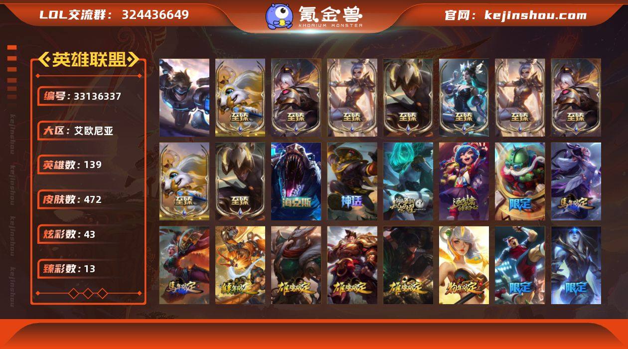 【AYL1054】139英雄/472皮肤/1终极/13神话/88限定/13臻彩/43炫彩/33传说/118史诗/未定级账号等级:128/星界起源/源计划刀妹/10周年 安妮/源代码 乐芙兰/新卧虎藏龙 贾克斯/至臻 源计划:正义 艾瑞莉娅/至臻 源计划正义 艾瑞莉娅(2022)/至臻 黑夜使者 李青/至臻 黑夜使者 李青(2022)/至臻 玉剑传说 武剑仙/至臻 玉剑传说 武剑仙(2022)/至臻 绒毛菲兹/至臻 绒毛 菲兹(2022)/至臻 星之守护者 辛德拉/海克斯 雷克顿/天龙之子 卡莎 飞龙乘云/无畏骑士 瑟庄妮 赤子初心/替父从军 花木兰 炫金龙刃/墨之影武者 亚索 金墨耀影/冠军之刃 锐雯 2016 凯旋圣装/冠军之隐 劫 凯旋圣装/源计划: 毁灭 派克 幻灭/霸天巨兽·雪崩 墨菲特/源计划: 火 菲奥娜 惩戒/星之守护者 霞 烈羽/魔女 阿卡丽 虚荣/净雪之月 莫甘娜 冬虹/红莲之刃 锐雯/替父从军 花木兰/广寒仙子 嫦娥/美猴王 孙悟空/张辽 文远/司马懿 仲达/虎痴之拳 蔚/春晖神女 拉克丝/觅心魔灵 奥利安娜/幸福女神 乐芙兰/圣诞开心鬼 提莫/圣诞精灵 崔丝塔娜/圣诞糖果棒 厄运小姐/圣诞狂欢 时光/“主人不要我了” 阿木木/胡桃夹子 小丑/平安夜女神 娑娜/英勇玩具兵船长/邪恶圣诞老人 维迦/夺命美人 卡特/冰雪节 茂凯/雪默丁格/雪装 奈德丽/圣诞玩...