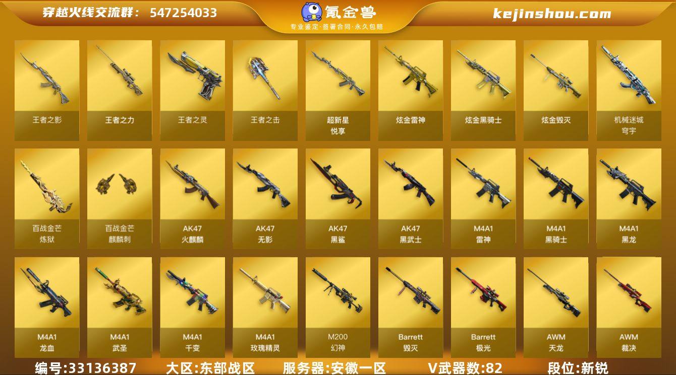 【ky6825】安徽一区-87V-6王者武器数-4炫金武器数 【热门武器】:M200-幻神,死亡之眼,金色小号,M4A1-黑骑士*3,汤姆逊-烈龙*2,RPK-盘龙*4,加特林-炼狱*6,沙鹰-修罗*5 【王者炫金武器】:超新星-悦享,王者之影,王者之力,王者之灵,王者之击,炫金骑士,炫金雷神,炫金毁灭*2 【音效卡】:屠龙-电竞之星-竞星跃动音效卡,AK47-火麒麟音效卡,Barrett-毁灭音效卡,HK417-朱雀-电竞之星-竞星跃动音效卡,炼狱-百战金芒-庆典舞曲音效卡 【皮肤】:AWM-裁决-百城联赛天津皮肤,雷神-暗月,雷神-星空,M4A1-再燃火线,雷神-神秘按键 皮肤,火麒麟-雷神,毁灭-暗月,毁灭-虹光风暴 皮肤,毁灭-英雄计划 皮肤,黑龙-能量核心,极光-能量核心,轻型军用手斧-再燃火线,龙啸-青青莓果 皮肤 【角色】:樱,迷迭香,零·纪元,不败狙神,王者-瞳-闭月羞花,葵-阿尔法武装,幻面灵狐,初恋灵狐,娟娟,灵狐者-黄金海岸,潘多拉-甜心教官,青霞仙子,雪莉杨-摸金校尉,樱-缤纷夏日,影武者-X 【人偶武器】:火麒麟-灵狐,M4A1-雷神-精英刀锋,迷你生化手雷,生化手雷-机甲核心,灵狐娃娃手雷 【暴走生化】:死亡之眼,超级对讲机 【挑战大师】:神圣爆裂者III,激光毁灭者III 【英雄...
