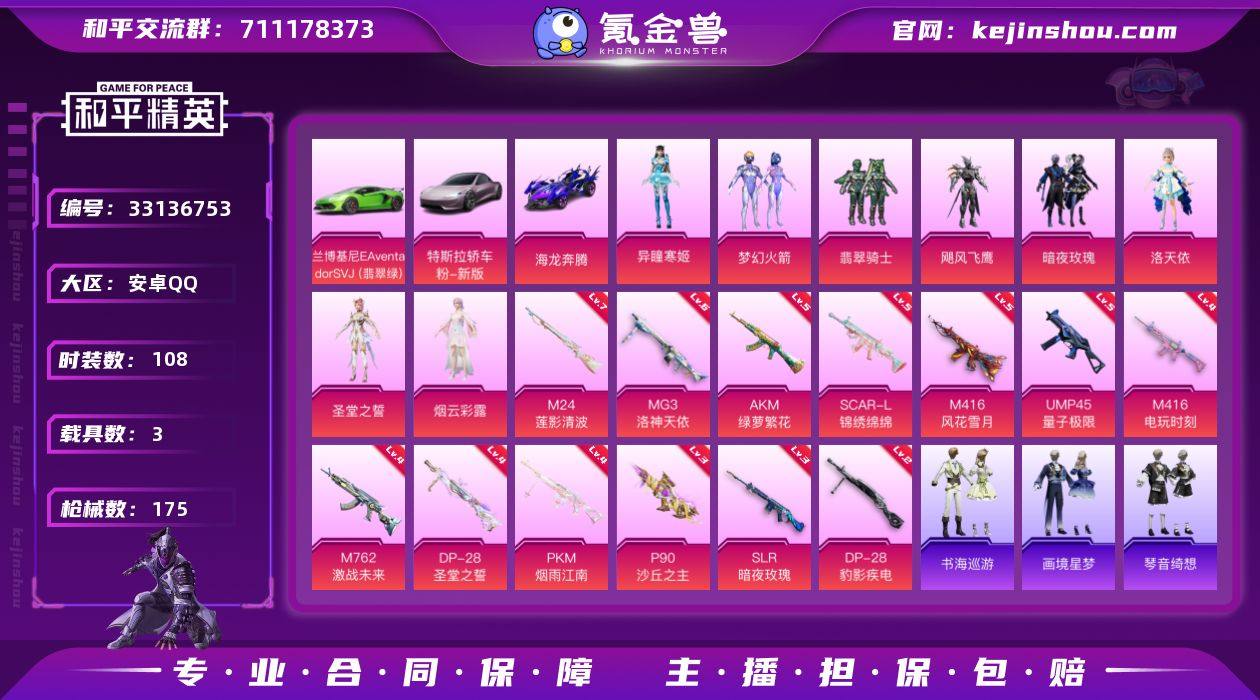 僚机安卓 手Q-8粉装-13特效枪-3载具-4粉色飞行器-66619热力值-8王牌印记-108套装-175枪皮 【热门品类】:粉装-梦幻火箭,套装-金羽特工,套装-龟仙人 【粉色套装】:粉装-梦幻火箭,粉装-翡翠骑士,粉装-飓风飞鹰,粉装-暗夜玫瑰,角色-洛天依,角色-圣堂之誓,角色-烟云彩露,角色-异瞳寒姬 【粉色枪皮等级】:AKM-绿萝繁花(五级),SCAR-L-锦绣绵绵(五级),M416-风花雪月(五级),M416-电玩时刻(四级),M762-激战未来(四级),UMP45-量子极限(五级),P90-沙丘之主(三级),M24-莲影清波(七级),SLR-暗夜玫瑰(三级),DP-28-圣堂之誓(四级),DP-28-豹影疾电(二级),MG3-洛神天依(六级),PKM-江南烟雨(四级) 【粉色载具】:特斯拉Roadster(沁心粉),兰博基尼Aventador SVJ(翡翠绿),海龙奔腾,空客H135-蔚蓝之翼 【粉色枪皮】:AKM-绿萝繁花,SCAR-L-锦绣绵绵,M416-风花雪月,M416-电玩时刻,M762-激战未来,UMP45-量子极限,P90-沙丘之主,M24-莲影清波,SLR-暗夜玫瑰,DP-28-圣堂之誓,DP-28-豹影疾电,MG3-洛神天依,PKM-江南烟雨 【粉色飞行器】:炫彩糖果飞行器,梦幻火箭飞行器,沙丘之主天马,暮色之舞飞行器 【粉色降落伞】:梦幻火箭降落伞,夏日绵绵冰降落伞,绮梦...