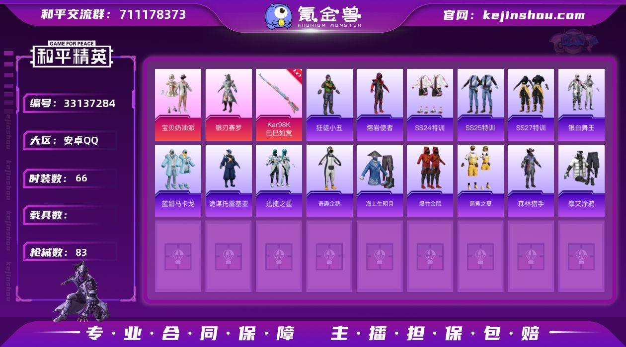 M1047446【2粉装-1特效枪 狂徒小丑】安卓手Q-2粉装-1特效枪-66套装-83枪皮-0王牌印记-英勇黄金Ⅱ-24673热力值【2粉装】宝贝奶油派,银刃赛罗【1特效枪】Kar98K-巳巳如意[1级]【1稀有】S686-浪客战士【2飞行器】粉色滑翔尾迹,终极赛罗飞行器【2背包】银河战甲背包,甜心宝贝背包【145其它衣服和枪皮】SS10特训,都市魅力,SS6特训,SS8特训,红色运动,雪山征服者,传奇侦探,霓虹街区,灼焰舞者,海上生明月,诡谋托雷基亚,萌趣颜团子,魅力单车,骁骑迪迦,奇趣企鹅,格斗先锋,黄色名流,森林猎手,科技之星,甜蜜告白,街头潮人,黄色运动,摩艾涂鸦,狂徒小丑,长空猛禽,吉莉礼服,SS31特训,SS25特训,圣诞大吉,甜蜜菠萝,牛气满满,野性战心,特训学院,迅捷之星,熔岩使者,蓝色运动,原初圣火,热血青春,逆风勇士,竞技勇士朋克,绮丽涂鸦,萌黄之夏,战地督导,蓝甜马卡龙,骑行爱好者,竞技名士,飞行日记,SS24特训,北国孤狼,蓝色守护者,雪山精英,夏日音浪,疯狂小兔子,凛冬战士,银白舞王,爆竹金鼠,蓝彩潮人,牛气冲天,特战装甲,坚韧舞者,冷焰舞者,治愈之星,SS27特训,猛禽,AUG-天降萌叽,撬棍-传奇侦探,Mini14-炫彩节奏,GROZA-生命誓言,Mk14-治愈之星,Vector-香水柠檬,DP-28-原初圣火,破片手榴弹-萌趣颜团子,UMP45-圣...