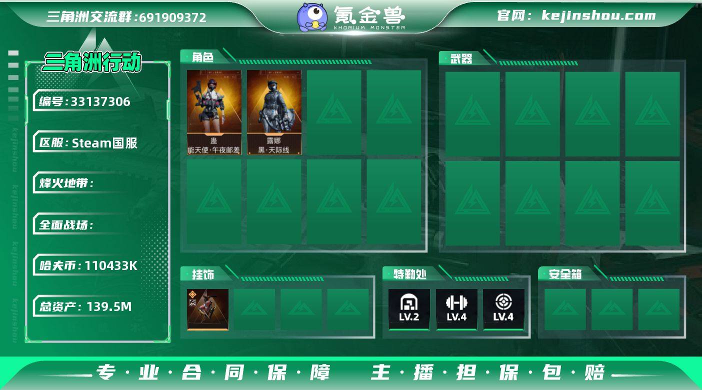 纯个人绿色手打Steam国服账号,45级,带初邮可以换绑。有纯币一亿一千万,总资产139.5M,附带一个六甲三个六头,两个红修,两把aw以及10发AW子弹。2个马上起飞等等如图所示。枪皮有锦绣,特斯拉线圈,万金泪冠,荼靡,等套系皮肤,干员有露娜和女医联动红皮。纯个人账号,急出可以砍价
