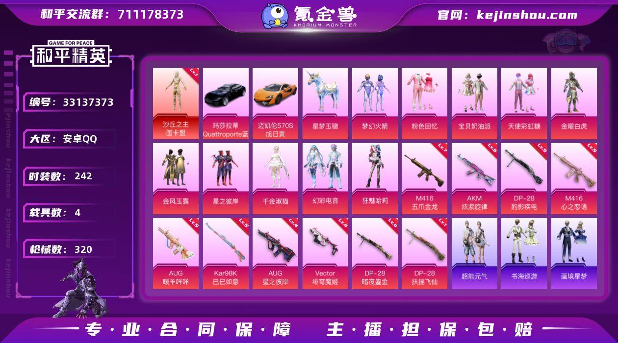 安卓 手Q-1神装-13粉装-14特效枪-4载具-6粉色飞行器-109085热力值-16王牌印记-242套装-320枪皮 【红色神装等级】:沙丘之主-图卡盟(一级) 【红色角色神装】:沙丘之主-图卡盟 【热门品类】:粉装-梦幻火箭,套装-金羽特工,套装-忍者信条,套装-龟仙人,套装-潮萌小黄鸭,套装-浪漫波比,M416-星际漫游 【粉色套装】:粉装-粉色回忆,粉装-宝贝奶油派,粉装-天使彩虹糖,粉装-金曜白虎,粉装-梦幻火箭,粉装-金风玉露,粉装-星之彼岸,角色-千金淑猫,粉装-幻彩电音,角色-狂魅哈莉,人物-小舞·灵珑,人物-小舞·恋语,角色-鸢尾珑雾 【粉色枪皮等级】:UMP45-霜月狼主(二级),AKM-炫紫旋律(六级),M416-五爪金龙(七级),M416-心之恋语(五级),AUG-星之彼岸(四级),AUG-暖羊咩咩(五级),ACE32-萌骑漫游(五级),Vector-绯穹魔姬(四级),AKS-74U-森灵之息(五级),Kar98K-巳巳如意(五级),Mk14-福马献瑞(五级),DP-28-扶摇飞仙(一级),DP-28-暗夜鎏金(四级),DP-28-豹影疾电(五级) 【粉色载具】:玛莎拉蒂Quattroporte(夜幕蓝),迈凯伦570S(旭日黄),星梦玉骢,暮色幽蹄 【粉色枪皮】:AKM-炫紫旋律,M416-五爪金龙,M416-心之恋语,AUG-星之彼岸,AUG-暖羊咩咩,ACE32-萌骑漫...