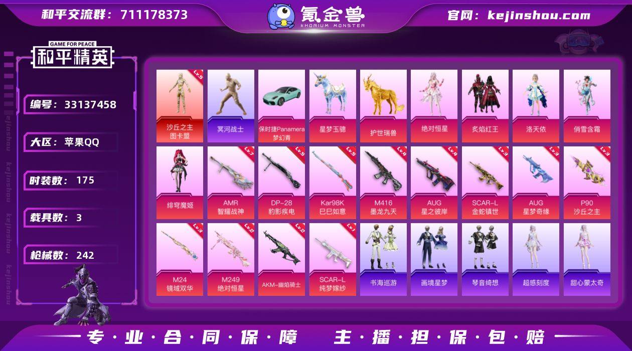 苹果【红装号 8套绝世印记/20王牌印记/沙丘之主-图卡盟(五级)/木乃伊/套装-暗影哥特/角色-洛天依/AUG-星梦奇缘(三级)/保时捷Panamera(梦幻青)/1神装-6粉装-14特效枪-3载具-9粉色飞行器】 手Q--84764热力值-20王牌印记-175套装-242枪皮 【红色神装等级】:沙丘之主-图卡盟(五级) 【红色角色神装】:沙丘之主-图卡盟 【热门品类】:套装-冥河战士,套装-小丑鱼,套装-暗影哥特,套装-粉红小猪,套装-红熊茄茄 【粉色套装】:角色-绝对恒星,粉装-炙焰红王,角色-洛天依,粉装-俏雪含霜,角色-绯穹魔姬,角色-辉云木星 【粉色枪皮等级】:AKM-幽焰骑士(二级),SCAR-L-纯梦嫁纱(一级),SCAR-L-金蛇镇世(三级),M416-墨龙九天(四级),AUG-星之彼岸(四级),AUG-星梦奇缘(三级),ACE32-萌骑漫游(二级),P90-沙丘之主(三级),Kar98K-巳巳如意(五级),M24-镜域双华(三级),Mk14-福马献瑞(五级),AMR-智耀战神(七级),M249-绝对恒星(二级),DP-28-豹影疾电(五级) 【粉色载具】:保时捷Panamera(梦幻青),星梦玉骢,护世瑞兽 【粉色枪皮】:AKM-幽焰骑士,SCAR-L-纯梦嫁纱,SCAR-L-金蛇镇世,M416-墨龙九天,AUG-星之彼岸,AUG-星梦奇缘,ACE32-萌骑漫游,P90-沙丘之主,Kar98K-巳巳...