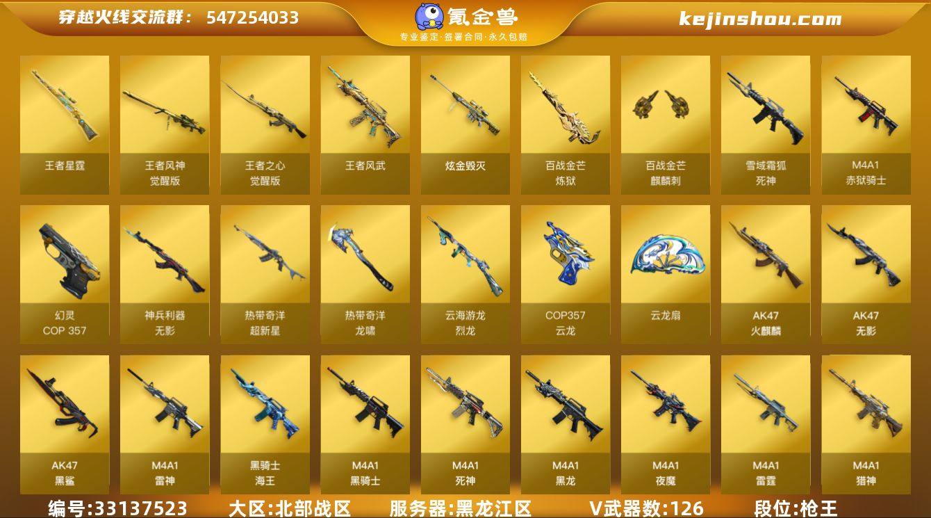 【ky6837】黑龙江区-136V-4王者武器数-1炫金武器数 【传说角色】:传说影煞 【热门武器】:QBZ03-金色蔷薇,Scar Light-白虎,M4A1-青龙,M200-幻神,M200-竞技荣光,死亡之眼,白虎-电玩蓝兔,柯尔特-冠军之特,M4A1-黑骑士,汤姆逊-烈龙*5,RPK-盘龙*2,加特林-炼狱,羊驼玩偶,白虎-枪娘安妮,雷神-小红,裁决-雪莉杨,COP-白鲨,USP-雷暴,COP 357-幻灵,沙鹰-修罗*2,炽芒蝶刃-荣耀世冠白鲨2023 皮肤,金刚伞 【王者炫金武器】:王者风武,王者星霆,炫金毁灭 【音效卡】:屠龙-动感闪耀 音效卡,M4A1-黑骑士音效卡,Barrett-毁灭音效卡,炼狱-百战金芒-庆典舞曲音效卡,死神-雪域霜狐-怀旧音效卡 【皮肤】:幻神-冠军之幻,AWM-裁决-百城联赛天津皮肤,裁决-羽掣 皮肤,白虎-大汉风骨,金色蔷薇-枪娘阿敏 皮肤,雷神-暗月,雷神-荣耀之魄,雷神-星空,雷神-冠军之魄,M4A1-战神赵云,雷神-R.LGD-CFPLS18冠军,雷神-烈虎皮肤,雷神-机甲刑天皮肤,雷神-宇航兔皮肤,M4A1-再燃火线,炼狱-月 皮肤,火麒麟-平天大圣,火麒麟-盘古,火麒麟-百城,火麒麟-心动糖果,毁灭-黑大圣皮肤,毁灭-神秘黑洞皮肤,毁灭-黑曼巴 皮肤,毁灭-航天科技皮肤,毁灭-英雄计划 皮肤,黑龙-能量...
