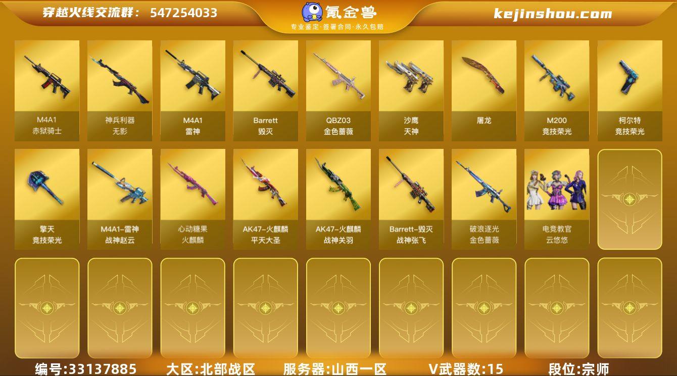 【ky6838】山西一区-18V-1王者武器数-0炫金武器数 【热门武器】:QBZ03-金色蔷薇,M200-竞技荣光 【王者炫金武器】:王者之魄闪光弹 【音效卡】:屠龙-电竞之星-竞星跃动音效卡,HK417-朱雀-电竞之星-竞星跃动音效卡 【皮肤】:金色蔷薇-破浪逐光 皮肤,M4A1-战神赵云,火麒麟-战神关羽,火麒麟-平天大圣,火麒麟-心动糖果,毁灭-战神张飞 【角色】:电竞教官-云悠悠,幻面灵狐,电竞少女,飞虎队-X,虎妞,嘉年华灵狐,斯沃特-X,兔囡囡,新娜塔莎,樱-战斗天使 【人偶武器】:AWM-灵狐-15周年嘉年华,迷你牛牛,生化手雷-机甲核心,深渊终结者手雷 【暴走生化】:超级对讲机 【挑战大师】:冰龙粉碎者-白马银枪,神圣爆裂者-末日III 【英雄级武器】:M4A1-雷神,QBZ03-金色蔷薇,无影-神兵利器,Barrett-毁灭,M200-竞技荣光,沙鹰-天神,柯尔特-竞技荣光,屠龙,擎天-竞技荣光,屠龙-电竞之星,高爆手雷-竞技荣光*2,闪光弹-竞技荣光,烟雾弹-竞技荣光*2,M4A1-赤狱骑士,AK47-竞魂无影 【其他武器】:源·火麒麟,魂·雷神-诺拉,魂·雷神-15周年嘉年华,灵·黑骑士-破界 I,源·天启,源·青龙,源·HK417-朱雀,魂·裁决-羽掣,魂·Barrett-朱雀-锦鲤,加特林-炼狱-掌火,魂·修罗...