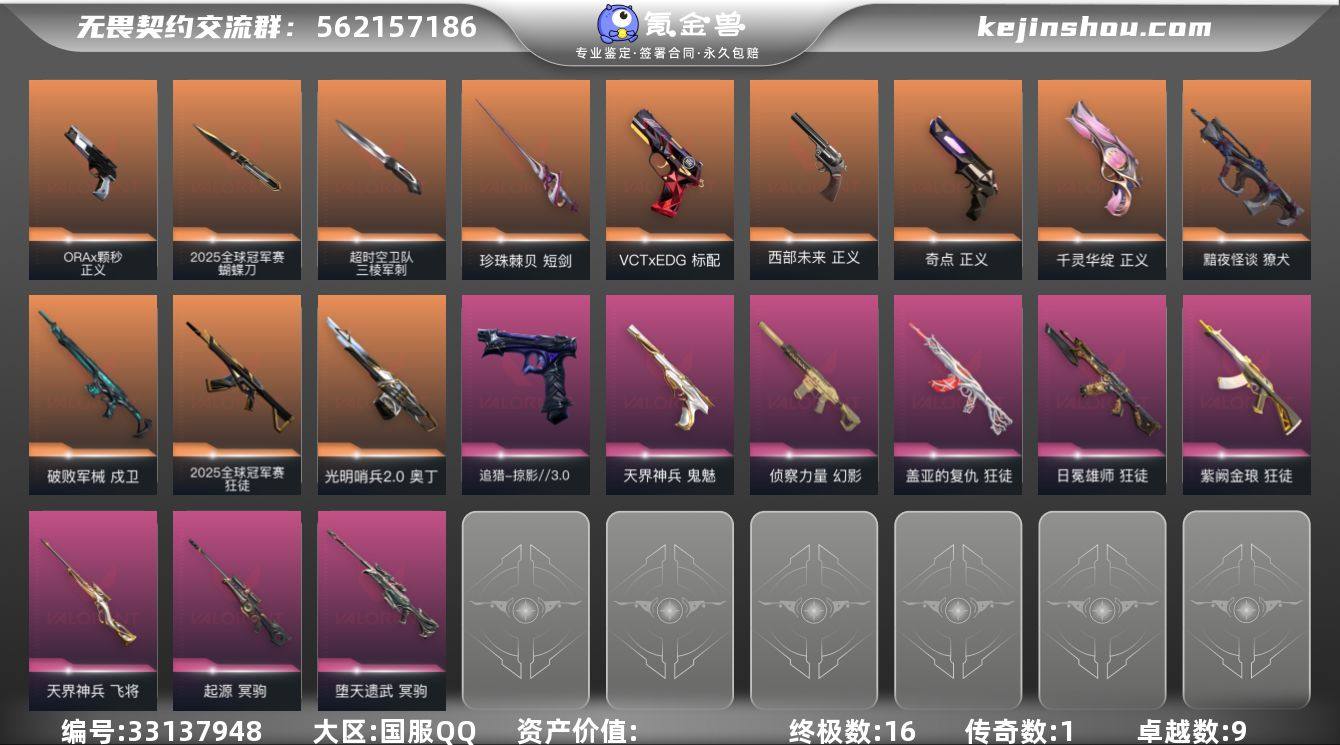 【套装】:2025全球冠军赛套装,VCTxEDG 队伍套装,掠影//3.0套装 【英雄】:幻棱,炼狱,维斯,暮蝶,钛狐,壹决,铁臂,捷风,雷兹,幽影,不死鸟,贤者,猎枭,蝰蛇,零,芮娜,奇乐,尚勃勒,霓虹,斯凯,夜露,星礈,K/O,海神,盖可,黑梦,钢锁 【近战武器】:近战武器-2025全球冠军赛 蝴蝶刀,近战武器-影蝶,近战武器-超时空卫队 三棱军刺,近战武器-黑波之刃,近战武器-镭切,近战武器-威龙之刃,近战武器-珍珠棘贝 短剑 【狂徒】:狂徒-2025全球冠军赛,狂徒-盖亚的复仇,狂徒-日冕雄师,狂徒-紫阙金琅 【幻影】:幻影-侦察力量,幻影-珍珠棘贝,幻影-神罚 【戍卫】:戍卫-破败军械,戍卫-珍珠棘贝 【獠犬】:獠犬-黯夜怪谈,獠犬-复古浪潮 【冥驹】:冥驹-堕天遗武,冥驹-起源,冥驹-复古浪潮 【飞将】:飞将-天界神兵 【莽侠】:莽侠-深海水族 【战神】:战神-深海水族 【奥丁】:奥丁-光明哨兵//2.0 【雄鹿】:雄鹿-复古浪潮 【骇灵】:骇灵-珍珠棘贝 【蜂刺】:蜂刺-深海水族 【追猎】:追猎-掠影//3.0 【标配】:标配-超能偶像 【VCT手枪】:标配-VCT x EDG 【正义】:正义-奇点,正义-千灵华绽,正义-西部未来,正义-ORA x 颗秒,正义-超限闪存,正义-沙尘幻...
