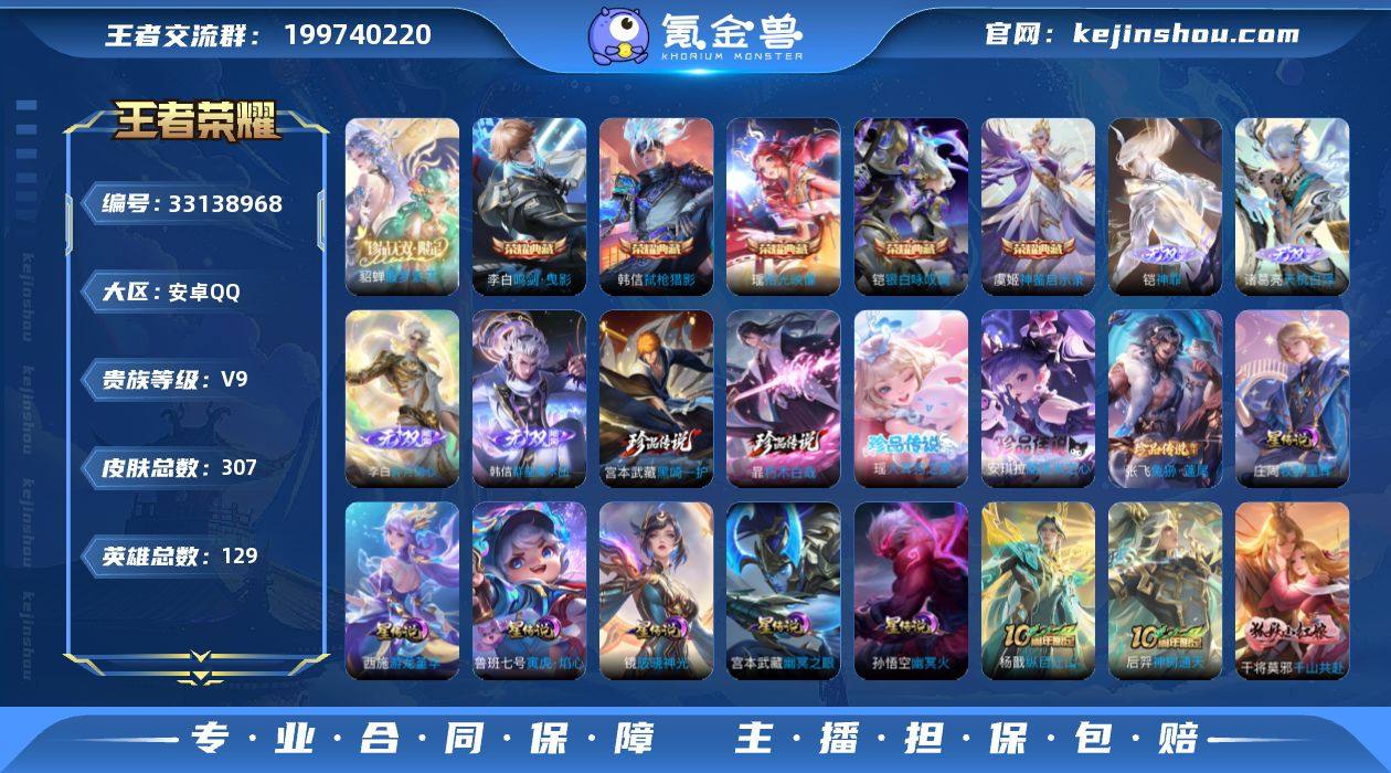 安Q区,307皮肤数量,1个珍品无双,5个典藏,四个无双,五珍品传说,55个传说数量,90个史诗,118个限定,23个星元,两个天幕,四个灵宝,75个按键!五个王者印记,五个荣耀印记,5800元