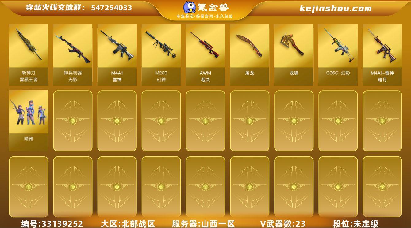 山西一区-32V-4王者武器数-0炫金武器数 【热门武器】:G36C-幻影,M200-幻神 【王者炫金武器】:斩神刀-雷暴王者 【音效卡】:屠龙-电竞之星-竞星跃动音效卡,G36C-幻影音效卡,HK417-朱雀-电竞之星-竞星跃动音效卡 【皮肤】:裁决-星际旅行 皮肤,雷神-暗月,屠龙-春桃 皮肤,龙啸-幻灵之哮 皮肤 【角色】:晴雅,太空指挥官,不败狙神,乔伊教练,修道士,云海玲珑,幻面灵狐,斗烈龙骑,飞虎队-X,风暴女,娟娟,兰-新年限定,潘多拉-X,潘多拉-甜心教官,兔囡囡,潘多拉-N,团团 【人偶武器】:雷神-研,AWM-灵狐-15周年嘉年华 【挑战大师】:AK47-冰龙粉碎者 【英雄级武器】:M4A1-雷神,无影-神兵利器,G36C-幻影,HK417-朱雀-电竞之星,天罚-斗烈龙驹,AWM-裁决,M200-幻神,Barrett-金色蔷薇,屠龙,龙啸*2,扳手-量子之心,屠龙-电竞之星,屠龙-斗烈龙驹,高爆手雷-雷暴王者,高爆手雷-量子之心*3,闪光弹-雷暴王者,闪光弹-量子之心*2,烟雾弹-雷暴王者,烟雾弹-量子之心*3,AK47-竞魂无影,AN94-竞魂超新星 【其他武器】:AK47-火麒麟-猫爪,御·黑龙-龙太子,源·雷神,魂·M4A1-雷神-化蛇,魂·雷神-神秘按键,魂·雷神-新春神龙,源·黑骑士,御·黑骑士-冰魄,魂·黑武...