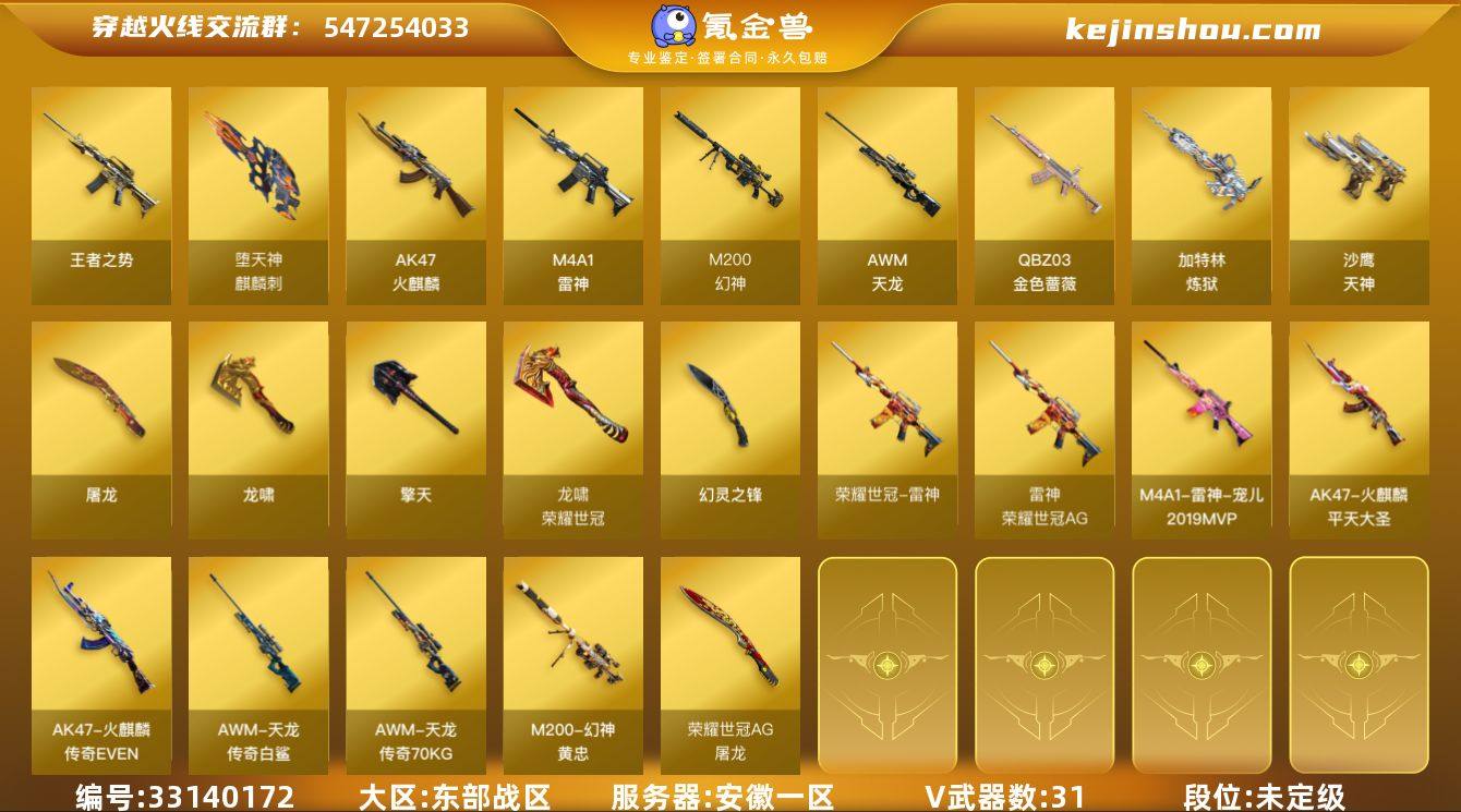 【商品标题】:安徽一区-31V-5王者-0炫金 【角色】:王者零-传说之路,青霞仙子 【热门武器】:M200-幻神,荣耀世冠-柯尔特,荣耀世冠-雷神,荣耀世冠-龙啸,加特林-炼狱,金色蔷薇-空 【王者炫金武器】:王者之势 【稀有皮肤】:屠龙-荣耀世冠AG,AK47-火麒麟-传奇EVEN,幻神-冠军之幻,幻神-宠儿-2021MVP,M200-幻神-黄忠皮肤,雷神-宠儿-2019MVP,雷神-荣耀世冠AG,黑骑士-摸金校尉,雷神-赛博朋克,火麒麟-平天大圣,AWM-天龙-传奇70KG,AWM-天龙-传奇白鲨,AWM-CFS 2020,M200-庆典-CFS 2021,雷神-脉冲核心 【其他皮肤】:金色蔷薇-空,QBZ03-吕布,AK47-B-身先士卒,AK47-B-常胜将军-曹操,AK47-B-常胜将军-刘备,AK47-齐天大圣,AK47-红水晶,98K-烛龙,HK417-赤龙 【人偶武器】:金色蔷薇-空,迷你艾比,AWM-灵狐-15周年嘉年华,M37-葵,迷你巨石泰坦-魔花研究所,灵狐娃娃手雷,闪光弹-貂蝉,高爆手雷-大乔 【音效卡】:幻神音效卡 【英雄级武器】:M4A1-雷神,M4A1-雷神,加特林-炼狱,AK47-火麒麟,AWM-天龙,沙鹰-天神,擎天,龙啸,屠龙,M200-幻神,QBZ03-金色蔷薇,幻灵之锋,麒麟刺-堕天神 【特殊枪械】:0白虎,0黑骑士,0烈龙,0盘龙,1炼狱,0蝴蝶斯泰尔