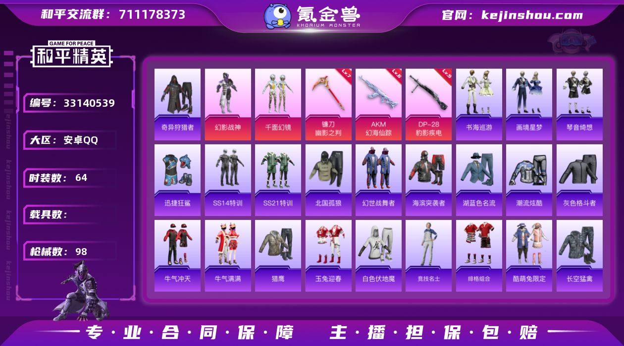 安卓 手Q-5粉装-7特效枪-0载具-1粉色飞行器-29145热力值-4王牌印记-64套装-98枪皮 【热门品类】:套装-奇异狩猎者 【粉色套装】:粉装-幻影战神,粉装-千面幻镜,角色-罪夜之冕,角色-辉云木星,人物-小舞·雪昙 【粉色枪皮等级】:AKM-幻海仙踪(六级),ACE32-萌骑漫游(三级),AKS-74U-森灵之息(五级),Mk14-福马献瑞(五级),DP-28-豹影疾电(五级),PKM-萌骑夺宝(二级),镰刀-幽影之判(七级) 【粉色枪皮】:AKM-幻海仙踪,ACE32-萌骑漫游,AKS-74U-森灵之息,Mk14-福马献瑞,DP-28-豹影疾电,PKM-萌骑夺宝,镰刀-幽影之判 【粉色飞行器】:炫彩糖果飞行器 【粉色降落伞】:香水柠檬降落伞,仲夏莫吉托降落伞,拂晓神骑降落伞,星梦奇缘降落伞,炫彩糖果降落伞,虹云熊熊降落伞 【稀有套装】:套装-雪国风尚,套装-炫彩糖果,角色-奈斯,套装-马上有钱,套装-迅捷龙虾,套装-书海巡游,套装-画境星梦,套装-琴音绮想,角色-霜刃之御,套装-雨过天青,套装-红釉青花 【稀有枪皮】:AUG-冰晶雪宝,AKM-夜灯,AKM-奇异狩猎者,AKM-龙的传人,M16A4-幻世战舞者,SCAR-L-炫彩节奏,SCAR-L-玉兔迎春,M416-绯红前夜,GROZA-治愈之星,GROZA-暮色玫影,QBZ-神秘黑猫,M762-奇异狩猎者,...