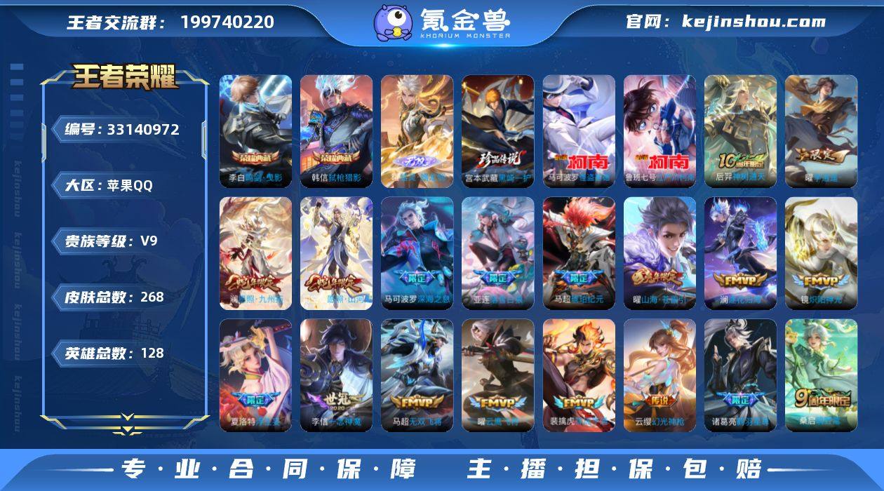 【精品推荐·全皮曜·全皮澜·鸣剑曳影·弑枪猎影·器灵螭龙剑·黑崎一护·江户川柯南·怪盗基德·李逍遥·深海之息·山海苍雷引·马超琥珀纪元·逐花归海·Kuromi时间天幕·财神纳福天幕·无二次包过】YXw21961-苹果Q-128英雄-268皮肤-12王者印记-150铭文-贵族积分10w【贵族9】【2典藏·1无双·3珍品·26传说·2天幕·22按键】【因赛季更新游戏段付以上号为准!】 【英雄全皮】:敖隐全皮,曜全皮,澜全皮,司空震全皮 【荣耀典藏】:李白鸣剑曳影,韩信弑枪猎影 【无双皮肤】:曜器灵螭龙剑 【珍品传说】:宫本武藏黑崎一护,鲁班七号江户川柯南,马可波罗怪盗基德 【天幕】:Kuromi时间天幕,财神纳福天幕 【传说皮肤】:后羿神树通天,司空震愿照山河定,澜愿照九州拓,云缨幻光神枪,裴擒虎祥瑞亨通,桑启鸣野蒿,亚连落雪白狼,马超琥珀纪元,铠琥珀纪元,澜逐花归海,诸葛亮鹤羽星尊,澜电玩雷克斯,夏洛特浮生妄,曜山海苍雷引,吕布怒海麟威,马可波罗深海之息,马超无双飞将,赵云淬星耀世,王昭君乞巧织情,曜李逍遥 ,铠绛天战甲,镜炽阳神光,虞姬启明星使,曜云鹰飞将,李信一念神魔,刘备时之恋人 【限定皮肤】:暃埋骨钱,蒙犽顽岩魄,大乔绒语心约,姜子牙天穹之誓,狄仁杰阴阳师,...