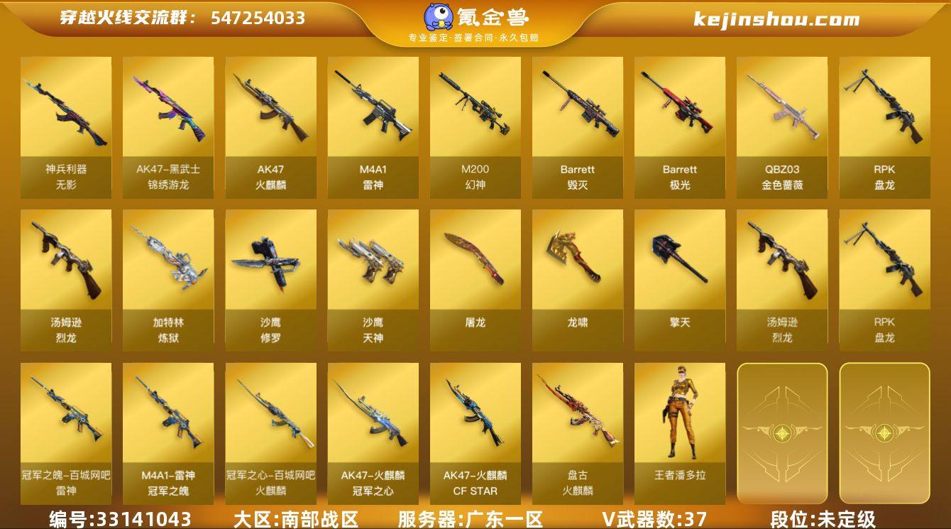 【商品标题】:广东一区-37V-3王者-1炫金 【角色】:王者潘多拉,灵动武士,职业选手,青霞仙子 【热门武器】:M200-幻神,柯尔特-冠军之特,黄金猫猫手套-白鲨,炼狱-迷你小钢,沙鹰-修罗,沙鹰-修罗,RPK-盘龙,RPK-盘龙,汤姆逊-烈龙,汤姆逊-烈龙,汤姆逊-烈龙,汤姆逊-烈龙,汤姆逊-烈龙,汤姆逊-烈龙,加特林-炼狱 【王者炫金武器】:炫金武士 【稀有皮肤】:雷神-冠军之魄,火麒麟-盘古,火麒麟-冠军之心,M200-幻神-N9-2022MVP,火麒麟-心动糖果,火麒麟-CFSTAR,修罗-CFSTAR,修罗-CFSTAR 【其他皮肤】:AK47-齐天大圣,AK47-苍龙,98K-烛龙,98K-黑金,98K-幻能朋克,加特林-炼狱-掌火 【人偶武器】:炼狱-迷你小钢,AWM-灵狐-15周年嘉年华,迷你波特博士 【音效卡】:火麒麟音效卡,幻神音效卡,雷神音效卡,白鲨语音包 【挑战大师】:冰龙粉碎者-白马银枪 【暴走生化】:炼狱-迷你小钢,超级对讲机 【英雄级武器】:M4A1-雷神,无影-神兵利器,黑武士-锦绣游龙,RPK-盘龙,RPK-盘龙,加特林-炼狱,汤姆逊-烈龙,汤姆逊-烈龙,汤姆逊-烈龙,汤姆逊-烈龙,汤姆逊-烈龙,汤姆逊-烈龙,AK47-火麒麟,Barrett-毁灭,Barrett-极光,Barrett-极光,沙鹰-修罗,沙鹰-修罗...