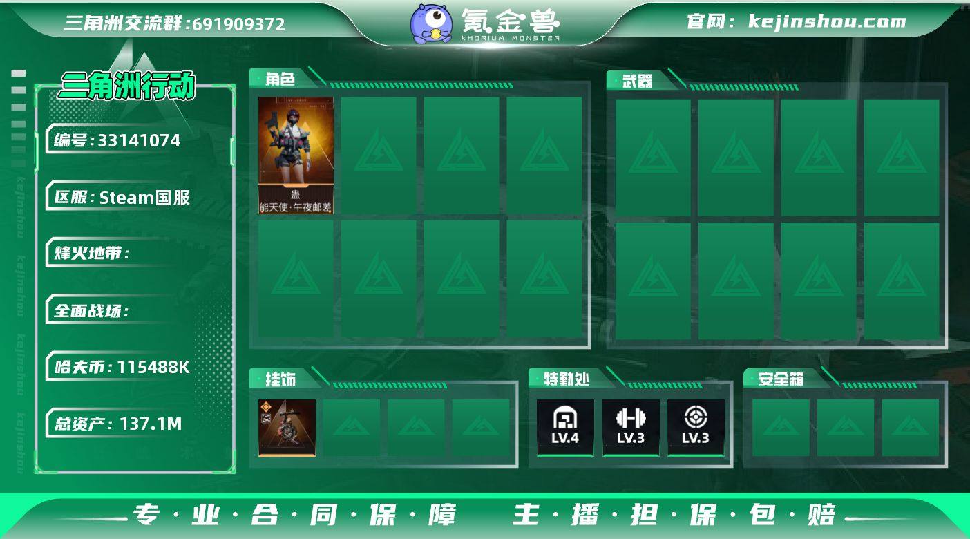 Steam国服纯个人绿色账号,44级,纯币一亿一千五百万,总资产137.1M,附带一把AW和10发子弹,一个六甲,三个六头,两个红修,一个炮弹等等如图。有干员皮肤女医联动红皮,枪皮有锦绣,鹅鸭杀,特斯拉线圈,万金泪冠,缄花等套系,,一个典藏挂饰。急出