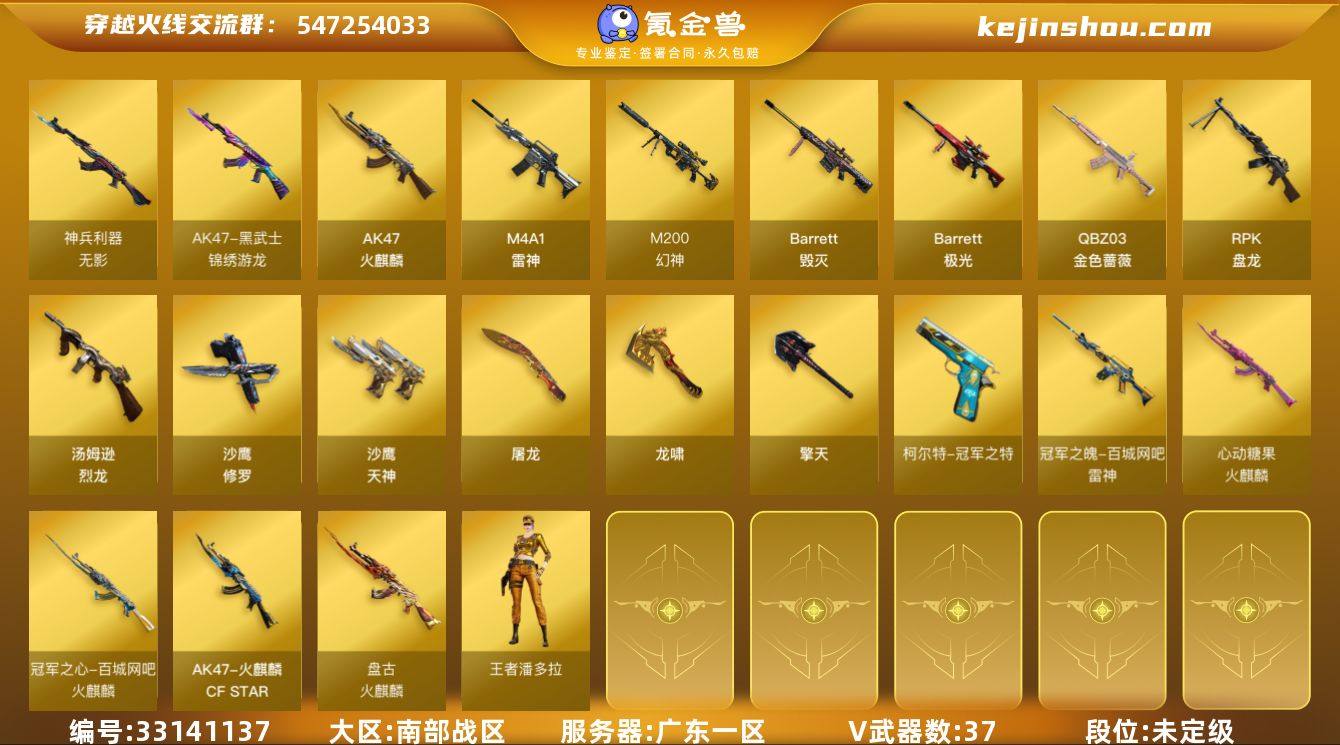 【商品标题】:广东一区-37V-3王者-1炫金 【角色】:王者潘多拉,灵动武士,职业选手,青霞仙子 【热门武器】:M200-幻神,柯尔特-冠军之特,黄金猫猫手套-白鲨,炼狱-迷你小钢,沙鹰-修罗,沙鹰-修罗,RPK-盘龙,RPK-盘龙,汤姆逊-烈龙,汤姆逊-烈龙,汤姆逊-烈龙,汤姆逊-烈龙,汤姆逊-烈龙,汤姆逊-烈龙,加特林-炼狱 【王者炫金武器】:炫金武士 【稀有皮肤】:雷神-冠军之魄,火麒麟-盘古,火麒麟-冠军之心,M200-幻神-N9-2022MVP,火麒麟-心动糖果,火麒麟-CFSTAR,修罗-CFSTAR,修罗-CFSTAR 【其他皮肤】:AK47-齐天大圣,AK47-苍龙,98K-烛龙,98K-黑金,98K-幻能朋克,加特林-炼狱-掌火 【人偶武器】:炼狱-迷你小钢,AWM-灵狐-15周年嘉年华,迷你波特博士 【音效卡】:火麒麟音效卡,幻神音效卡,雷神音效卡,白鲨语音包 【挑战大师】:冰龙粉碎者-白马银枪 【暴走生化】:炼狱-迷你小钢,超级对讲机 【英雄级武器】:M4A1-雷神,无影-神兵利器,黑武士-锦绣游龙,RPK-盘龙,RPK-盘龙,加特林-炼狱,汤姆逊-烈龙,汤姆逊-烈龙,汤姆逊-烈龙,汤姆逊-烈龙,汤姆逊-烈龙,汤姆逊-烈龙,AK47-火麒麟,Barrett-毁灭,Barrett-极光,Barrett-极光,沙鹰-修罗,沙鹰-修罗...