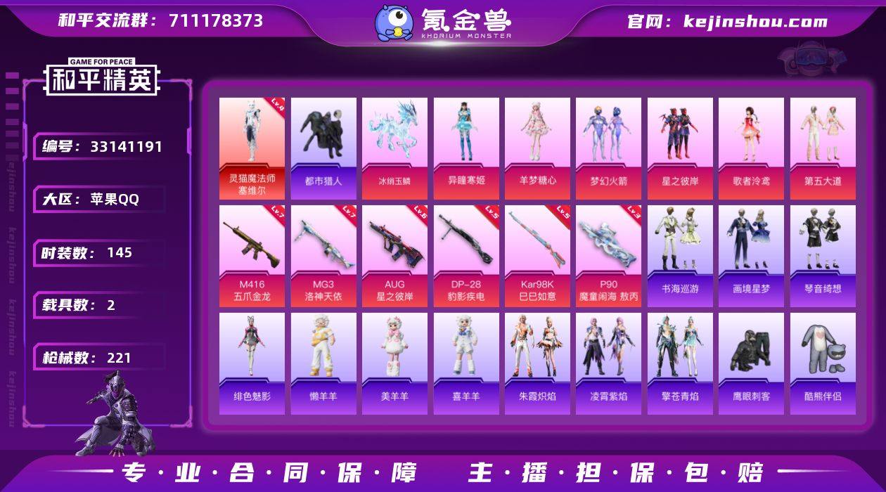 苹果 手Q-无敌战神框-2神装-6粉装-9特效枪-2载具-6粉色飞行器-75782热力值-15王牌印记-145套装-221枪皮 【红色神装等级】:暮色玫影-艾丽娅(一级),灵猫魔法师-塞维尔(四级) 【红色角色神装】:暮色玫影-艾丽娅,灵猫魔法师-塞维尔 【热门品类】:粉装-梦幻火箭,套装-浪漫天命,套装-都市猎人,角色-军刀雅典娜,套装-金羽特工,套装-龟仙人,套装-粉红小猪 【粉色套装】:粉装-梦幻火箭,粉装-星之彼岸,角色-歌者泠鸢,粉装-第五大道,角色-羊梦糖心,角色-异瞳寒姬 【粉色枪皮等级】:AKM-暮色玫影(三级),M416-五爪金龙(七级),AUG-星之彼岸(六级),AKS-74U-森灵之息(五级),P90-魔童闹海 敖丙(三级),Kar98K-巳巳如意(五级),DP-28-豹影疾电(五级),MG3-洛神天依(七级),燃烧瓶-薄荷可可(五级) 【粉色载具】:冰绡玉鳞,暮色幽蹄 【粉色枪皮】:AKM-暮色玫影,M416-五爪金龙,AUG-星之彼岸,AKS-74U-森灵之息,P90-魔童闹海 敖丙,Kar98K-巳巳如意,DP-28-豹影疾电,MG3-洛神天依,燃烧瓶-薄荷可可 【粉色飞行器】:星之彼岸飞行器,歌者泠鸢飞行器,灵猫魔法师飞行器,飞天猪飞行器,暮色之舞飞行器 【粉色降落伞】:梦幻火箭降落伞,星之彼岸降落伞,暗夜玫瑰降落伞,...