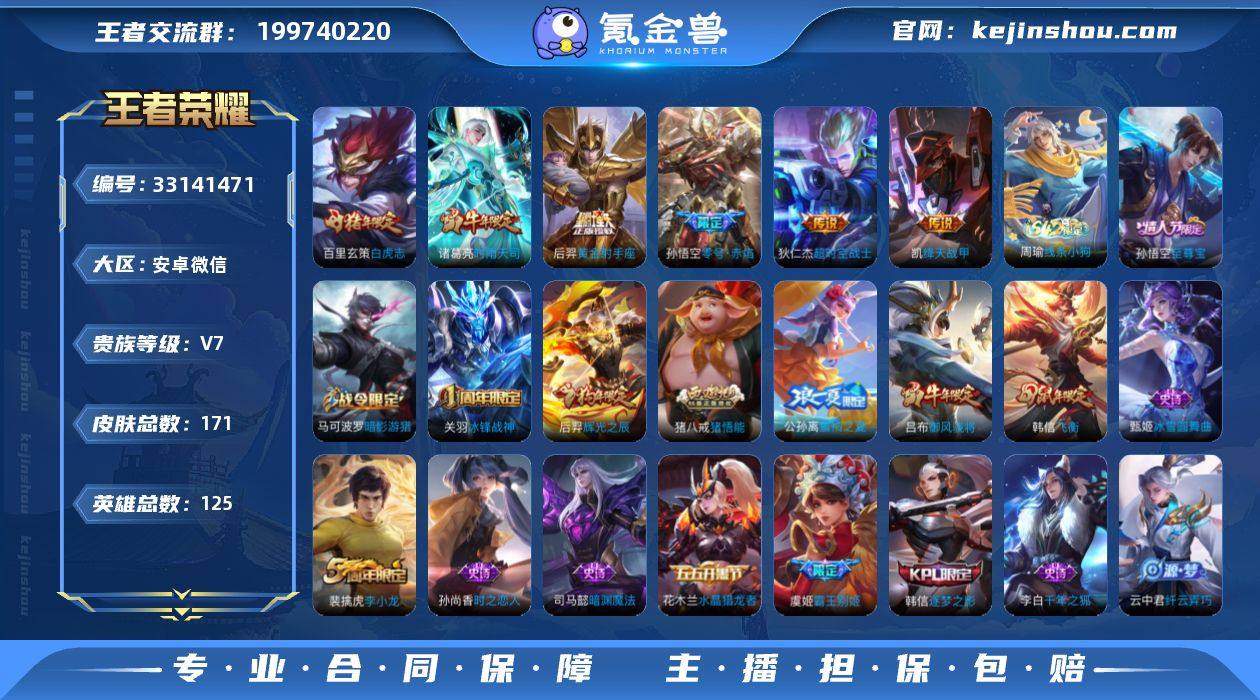 AL696645 【特价贵7打野发育路自玩4银标-猴子至尊宝-百里玄策白虎志-孙悟空零号赤焰,诸葛亮时雨天司,铠绛天战甲,狄仁杰超时空战士,后羿黄金射手座,吕布御风骁将,后羿辉光之辰,韩信飞衡】 皮肤数171 传说皮肤数6 英雄数125 营地id544675849 贵族等级【文本】贵族7级 【贵族7级】 内测皮肤2 年限皮肤5 限定皮肤58 赛季限定24 史诗皮肤51 战令限定11 勇者皮肤75 其他皮肤39 内测皮肤:艾琳女武神,孙尚香蔷薇恋人; 年限皮肤:诸葛亮时雨天司,吕布御风骁将,百里玄策白虎志,后羿辉光之辰,韩信飞衡; 限定皮肤:刘邦剑破天穹,艾琳女武神,猪八戒猪悟能,庄周高山流水,苏烈千军破阵,老夫子航海奇遇记,墨子神迹守卫,公孙离蜜橘之夏,孙尚香蔷薇恋人,韩信逐梦之影,鲁班七号乒乒小将,伽罗天狼溯光者,钟馗驱傩正仪,米莱狄胡桃异想国,高渐离死亡摇滚,关羽冰锋战神,程咬金演武夺筹,达摩星际陆战队,孙悟空零号赤焰,诸葛亮时雨天司,虞姬霸王别姬,吕布御风骁将,狄仁杰魔术师,狄仁杰万华元夜,云中君纤云弄巧,雅典娜单词大作战,蒙犽狂想玩偶喵,百里玄策白虎志,裴擒虎李小龙,鬼谷子原初探秘者,百里玄策原初追逐者,马可波罗暗影游猎,猪八戒西部大镖客,...