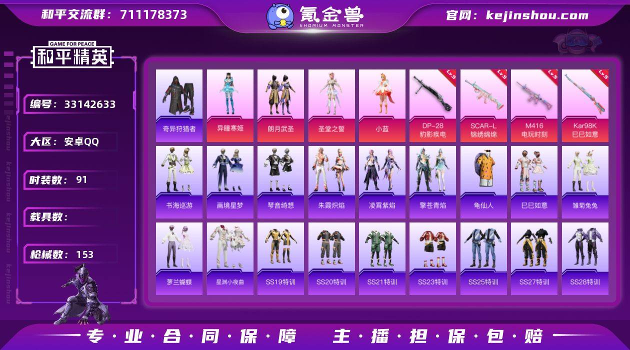 安卓 手Q-4粉装-6特效枪-0载具-1粉色飞行器-42014热力值-3王牌印记-91套装-153枪皮 【热门品类】:套装-奇异狩猎者,套装-龟仙人 【粉色套装】:粉装-朗月武圣,角色-圣堂之誓,角色-小蓝,角色-异瞳寒姬 【粉色枪皮等级】:SCAR-L-锦绣绵绵(五级),M416-电玩时刻(五级),UMP45-萌骑冒险(三级),Kar98K-巳巳如意(五级),Mk14-福马献瑞(五级),DP-28-豹影疾电(五级) 【粉色枪皮】:SCAR-L-锦绣绵绵,M416-电玩时刻,UMP45-萌骑冒险,Kar98K-巳巳如意,Mk14-福马献瑞,DP-28-豹影疾电 【粉色飞行器】:太空嘟嘟飞行器 【粉色降落伞】:恐龙拽拽降落伞,橘柚倾心降落伞,垂柳戏鸭降落伞,巴啦啦小魔仙降落伞,精灵梦叶罗丽降落伞,月影灵韵降落伞,圣斗士星矢降落伞,宁雨蝶降落伞,喜羊羊与灰太狼降落伞,异瞳寒姬降落伞 【稀有套装】:套装-龟仙人,套装-巳巳如意,套装-马上有钱,套装-雏菊兔兔,套装-萝兰蝴蝶,套装-星渊小夜曲,套装-朱霞炽焰,套装-凌霄紫焰,套装-擎苍青焰,套装-书海巡游,套装-画境星梦,套装-琴音绮想,套装-雨过天青,套装-红釉青花 【稀有枪皮】:AKM-江南烟雨,AKM-灼热熔岩,AKM-霓虹街区,AKM-龙的传人,M16A4-幻世战舞者,SCAR-L-炫彩节奏,M416...