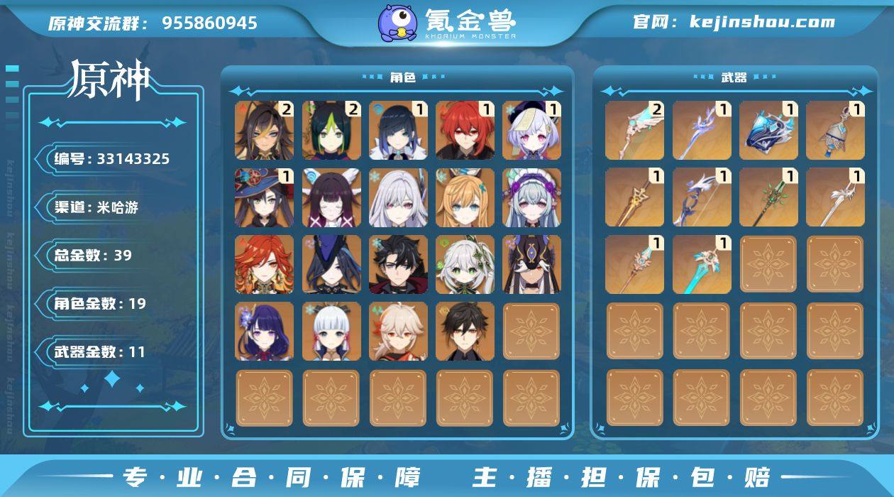 【YSX1891】59级/39黄/女主/19个五星角色/11个五星武器/丝柯克/爱可菲/一命夜兰/神里绫华/二命提纳里/玛薇卡/钟离/克洛琳德/雷电将军/哥伦比娅/枫原万叶/纳西妲/一命莫娜/梦见月瑞希/莱欧斯利/赛诺/一命迪卢克/一命七七/二命迪希雅/若水/天空之翼/万世流涌大典/图莱杜拉的回忆/和璞鸢/天空之脊/苍耀/天空之刃/风鹰剑/圣显之钥