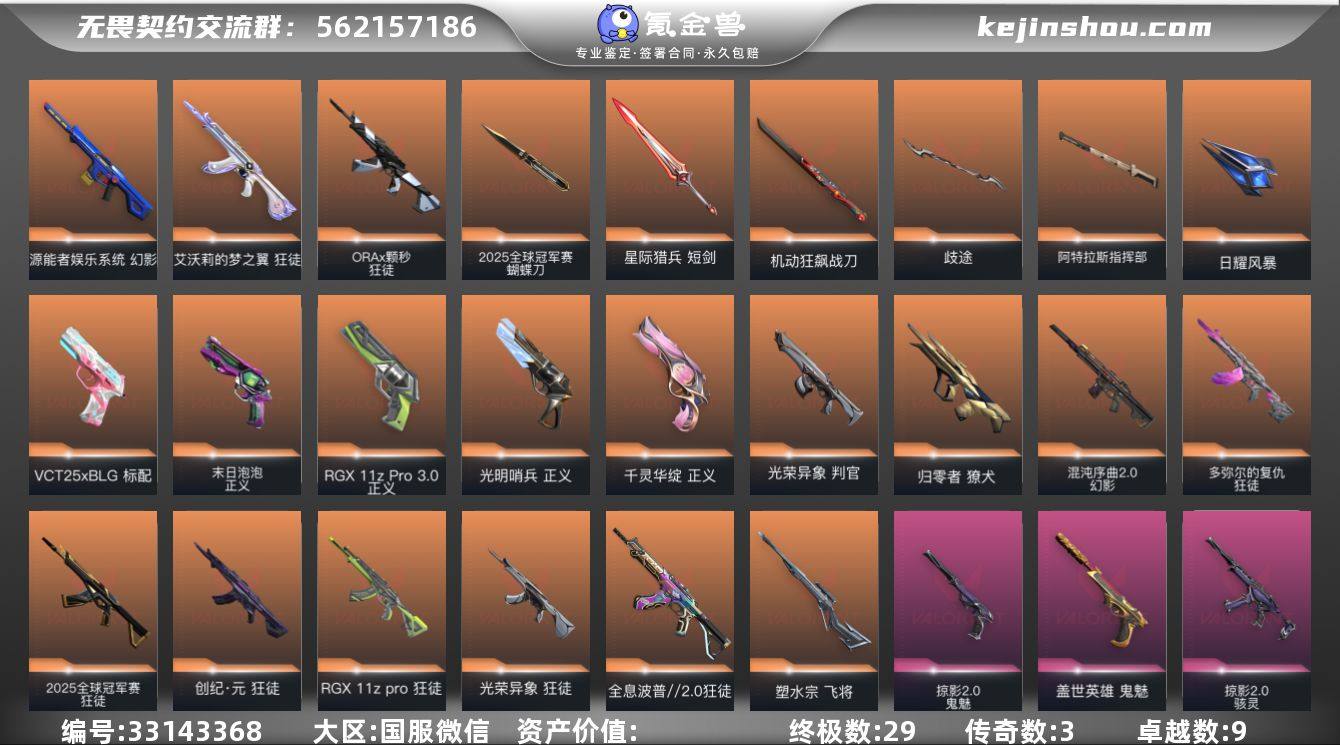 【943208】[18033603]段位: 白银 套装: 光荣异象,掠影2.0套装,2025全球冠军赛 近战武器皮肤: 机动狂飙战刀,黑波之刃-塑水宗,街机高手-源能者娱乐系统,穿花蝴蝶-黑市,镭切-创·纪元,光荣异象 歧途,日耀风暴,阿特拉斯指挥部,影钩-掠影2.0,星际猎兵 短剑,2025全球冠军赛 蝴蝶刀,碎心裂刃 步枪皮肤: 狂徒-盖亚的复仇,獠犬-归零者,狂徒-堕天遗武,幻影-源能者娱乐系统,狂徒-艾沃莉的梦之翼,狂徒-全息波普//2.0,戍卫-掠影,狂徒-创·纪元,狂徒-离子武器2.0,狂徒-RGX 11z pro,狂徒-光荣异象,幻影-掠影2.0,2025全球冠军赛 狂徒,幻影-混沌序曲2.0,多弥尔的复仇 狂徒,狂徒-ORAx颗秒,超集系统 狂徒,蒙太奇 幻影,风暴之子 戍卫 佩枪皮肤: 鬼魅-盖世英雄,正义-千灵华绽,正义-RGX 11z Pro 3.0,正义-光明哨兵,标配-VCT25xBLG,标配-光荣异象,鬼魅-掠影2.0,正义-末日泡泡,超集系统 标配,风暴之子 正义 狙击枪皮肤: 飞将-塑水宗,冥驹-光荣异象,风暴之子 冥驹,超集系统 飞将 冲锋枪皮肤: 骇灵-掠影2.0,蒙太奇 骇灵 霰弹枪皮肤: 判官-光荣异象,风暴之子 雄鹿 机枪皮肤: 奥丁-掠影2.0,蒙太奇 战神 亮点: 【优质装备】:2025全球冠军赛,2025全球冠军赛 蝴蝶刀,幻影-源能者娱乐系统,狂徒-艾沃莉的梦之翼,狂...